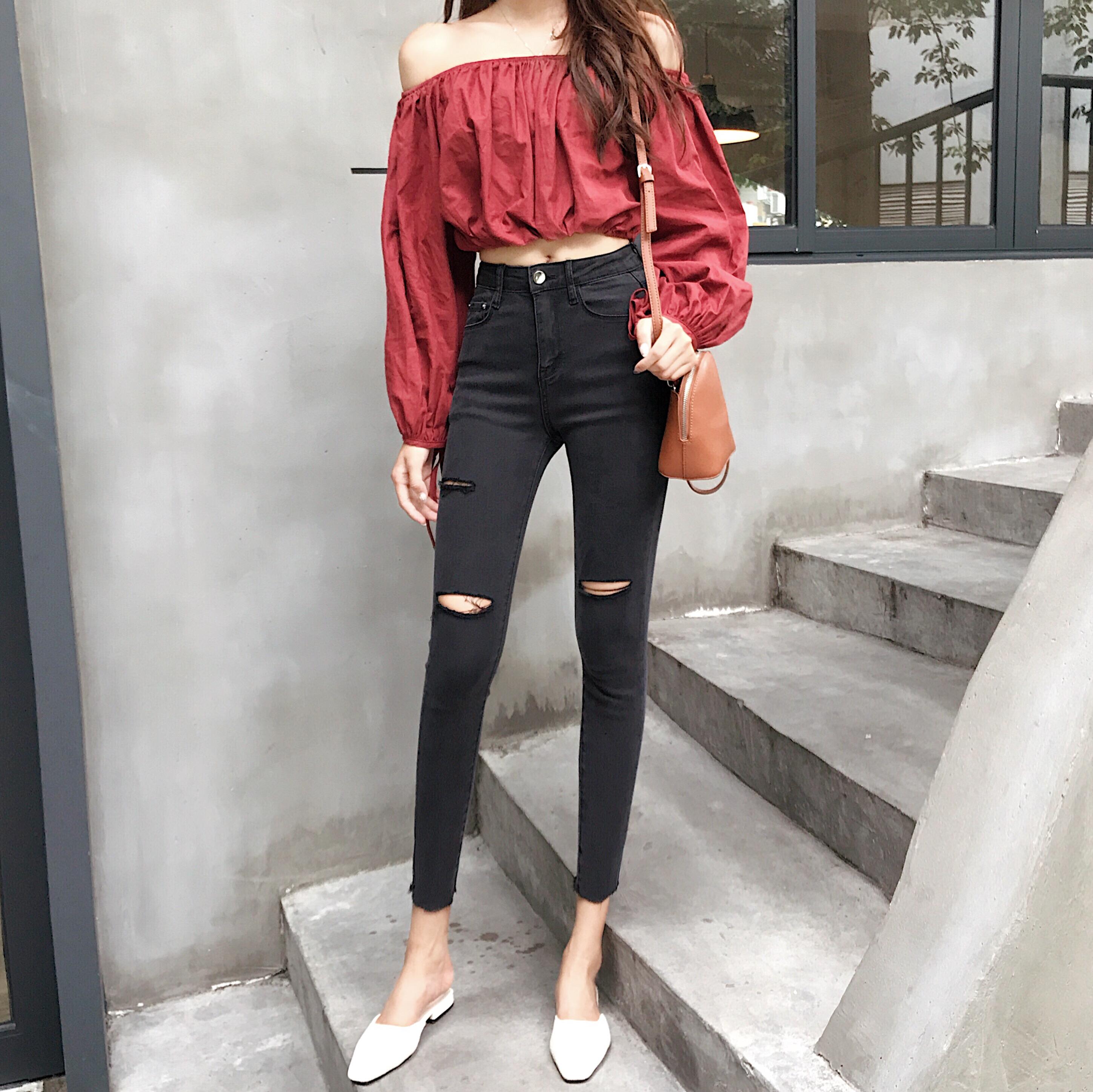/ 褲子2018新款韓版顯瘦高腰社會乞丐褲小腳九分褲時尚破洞牛仔褲女