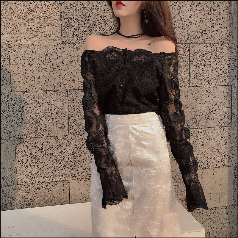 復古韓國chic風性感透視蕾絲鏤空高領顯瘦透視網紗喇叭袖內搭上衣