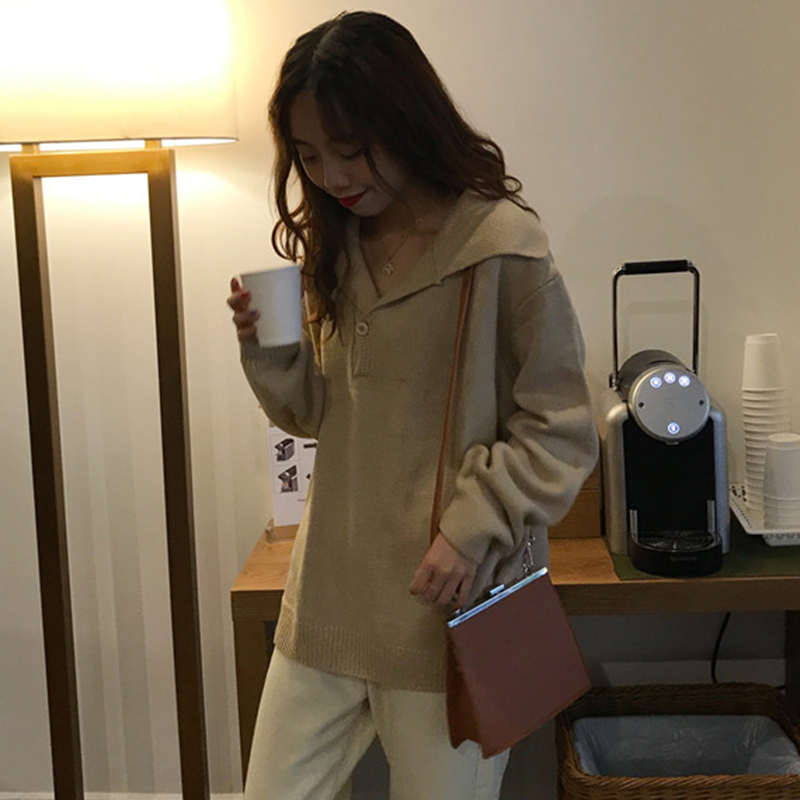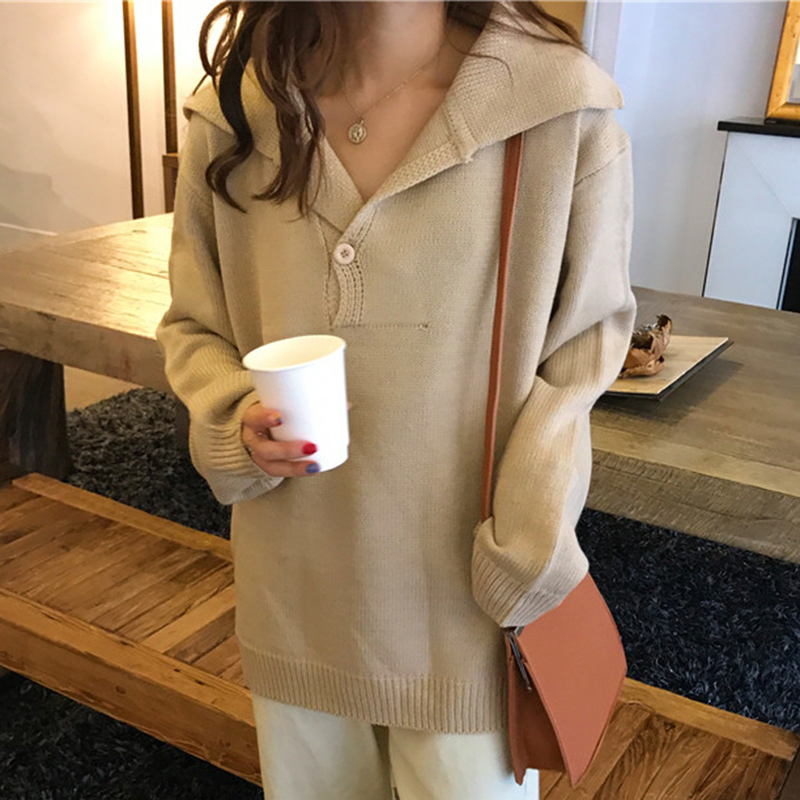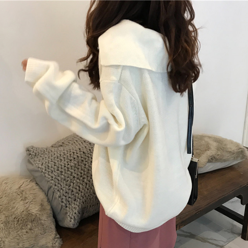 翻領寬松長袖毛衣女秋冬裝2018新款慵懶針織外套學生時尚白色上衣