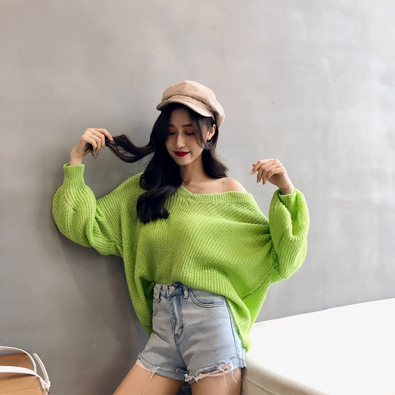 chic早秋上衣慵懶寬松糖果色網紅毛衣女韓版純色時尚V領針織衫潮