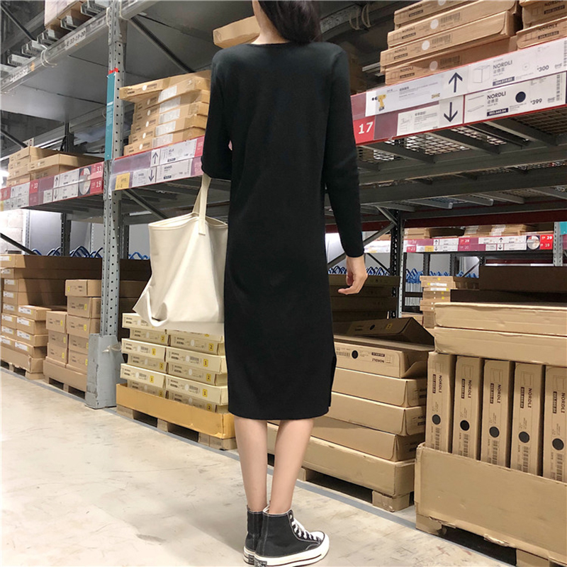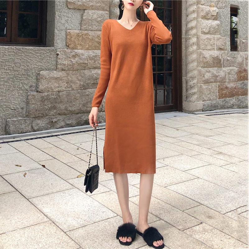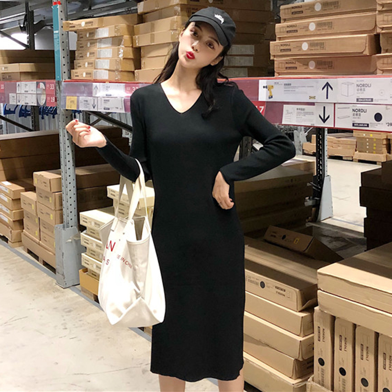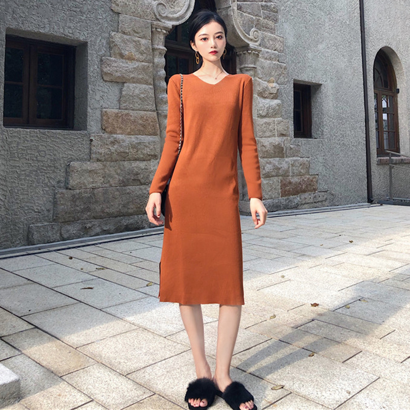 秋裝女2018新款復古V領長袖側開叉氣質長袖學生顯瘦針織連衣裙女
