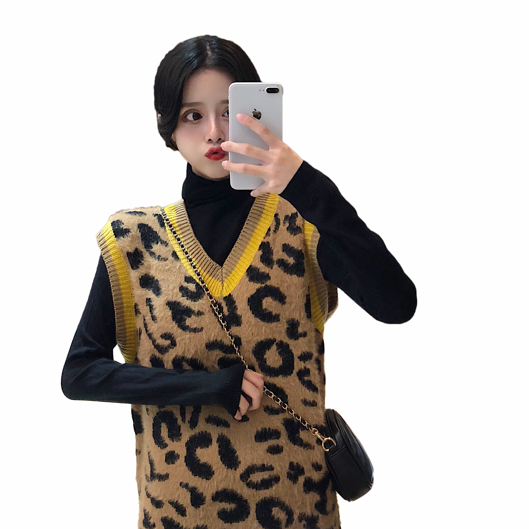 復古韓國chic風豹紋V領針織衫時尚慵懶寬松中長款無袖毛衣馬甲女