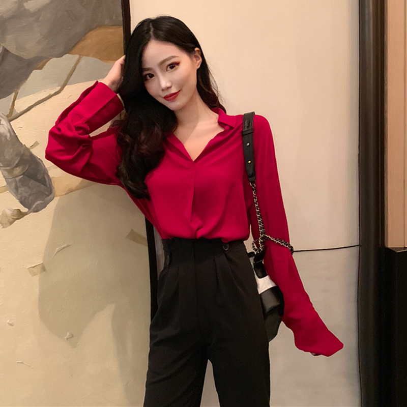 / 兩件套裝女秋冬時尚V領紅色長袖襯衫高腰顯瘦九分褲休閑西裝褲子