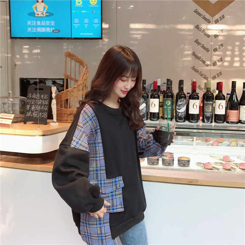 秋冬韓版原宿風中長款寬松不規則拼接格子套頭超火衛衣上衣外套女