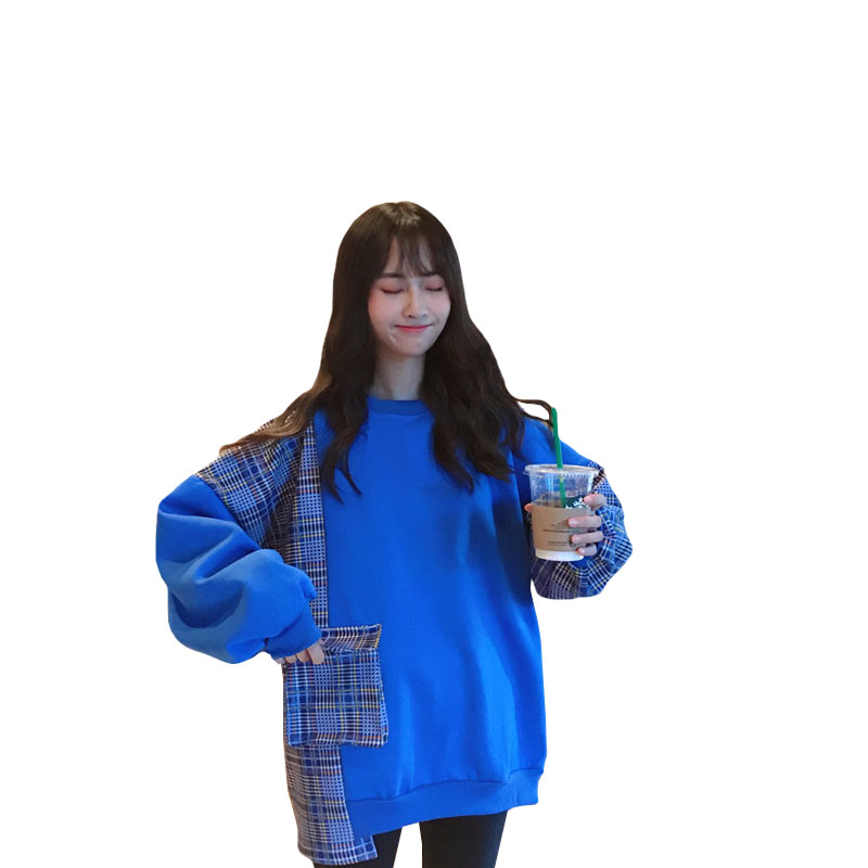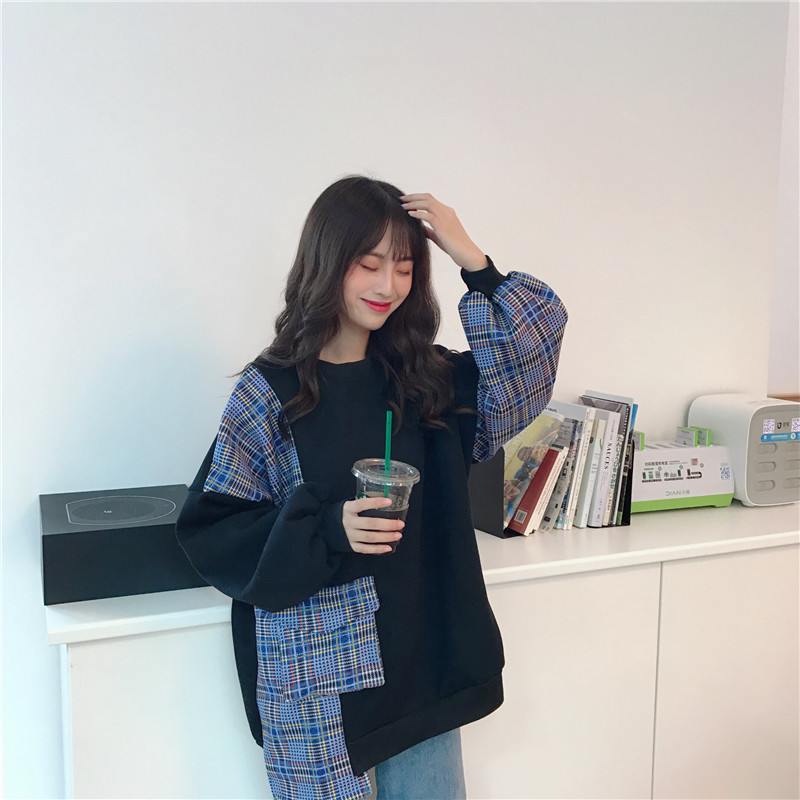 / 秋冬韓版原宿風中長款寬松不規則拼接格子套頭超火衛衣上衣外套女