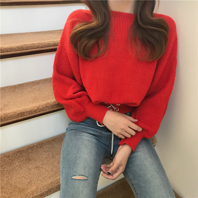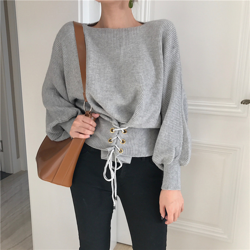 / 港味chic2018新款韓版純色寬松收腰百搭顯瘦長袖毛衣系帶套頭上衣