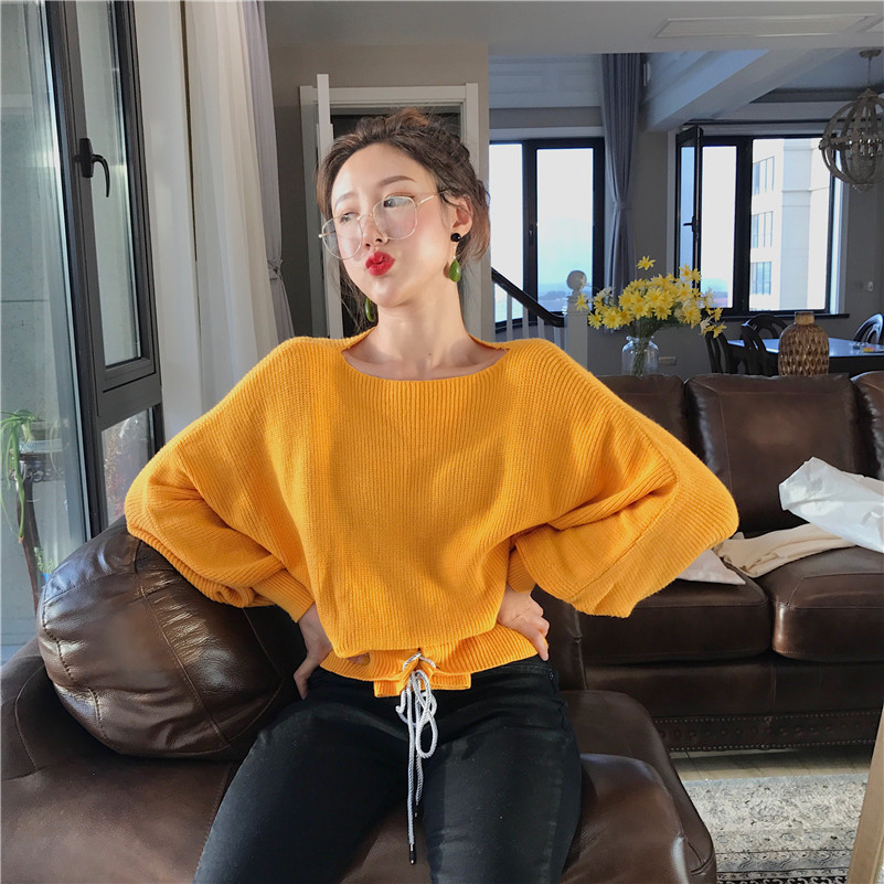 港味chic2018新款韓版純色寬松收腰百搭顯瘦長袖毛衣系帶套頭上衣