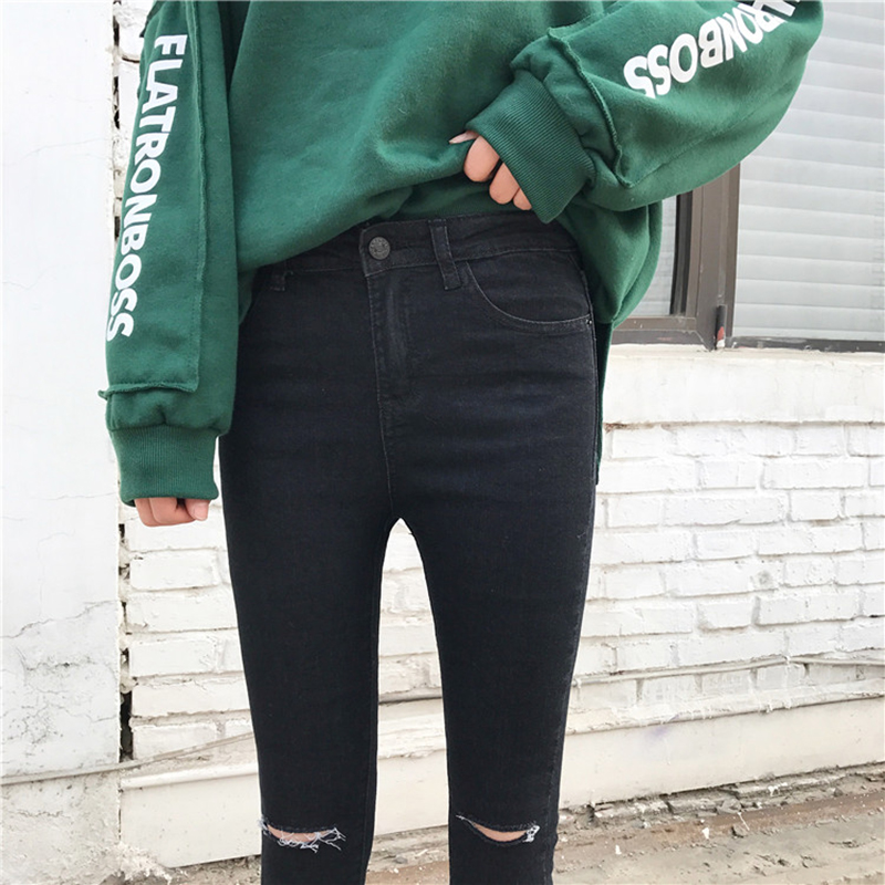 夏季新款女裝高腰修身顯瘦緊身彈力破洞毛邊學生小腳九分牛仔褲女
