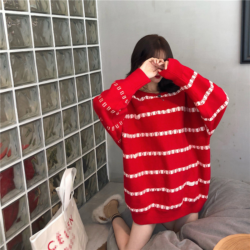 / 韓版chic百搭慵懶風oversize毛衣女寬松顯瘦條紋中長款減齡毛線衣