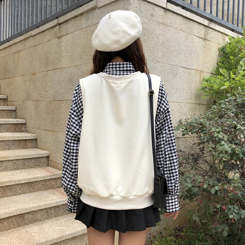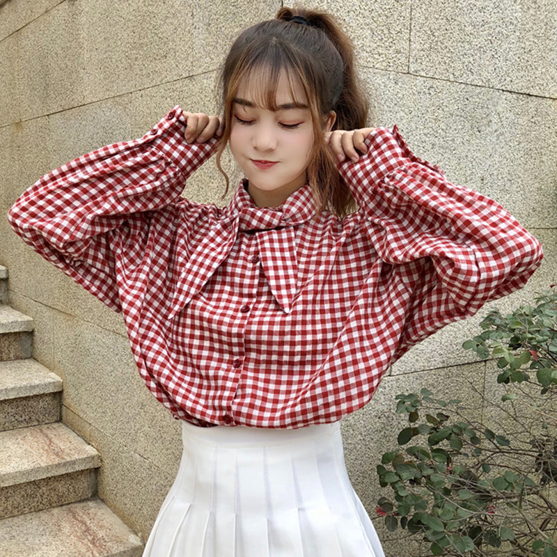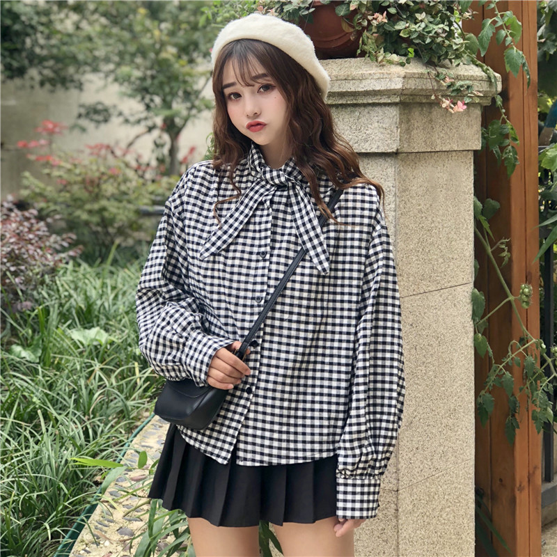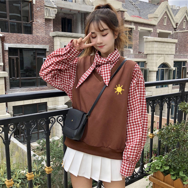/ 兩件套女秋裝2018新款復古蝴蝶結格子長袖襯衫+學生印花馬甲背心