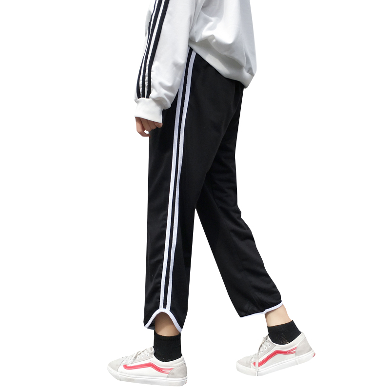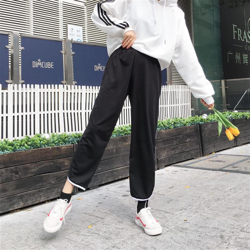 / 春季新款女裝韓版寬松側條紋休閑褲子女學生百搭顯瘦九分闊腿褲潮