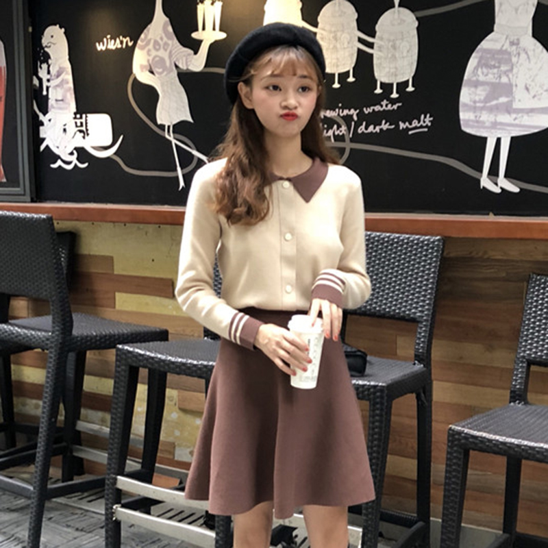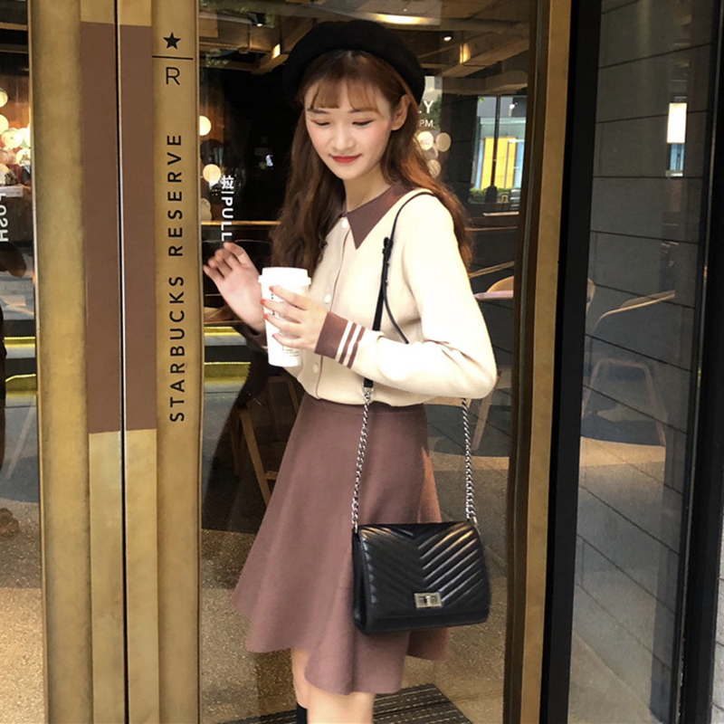 / 套裝女早秋新款復古小翻領撞色長袖針織衫+高腰針織半身裙兩件套