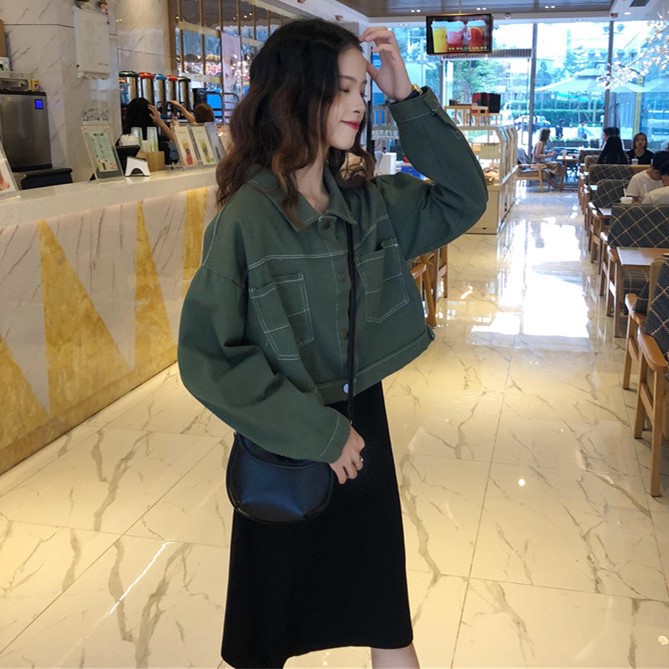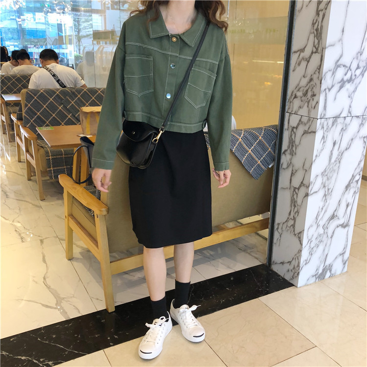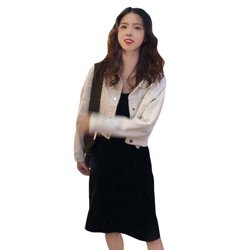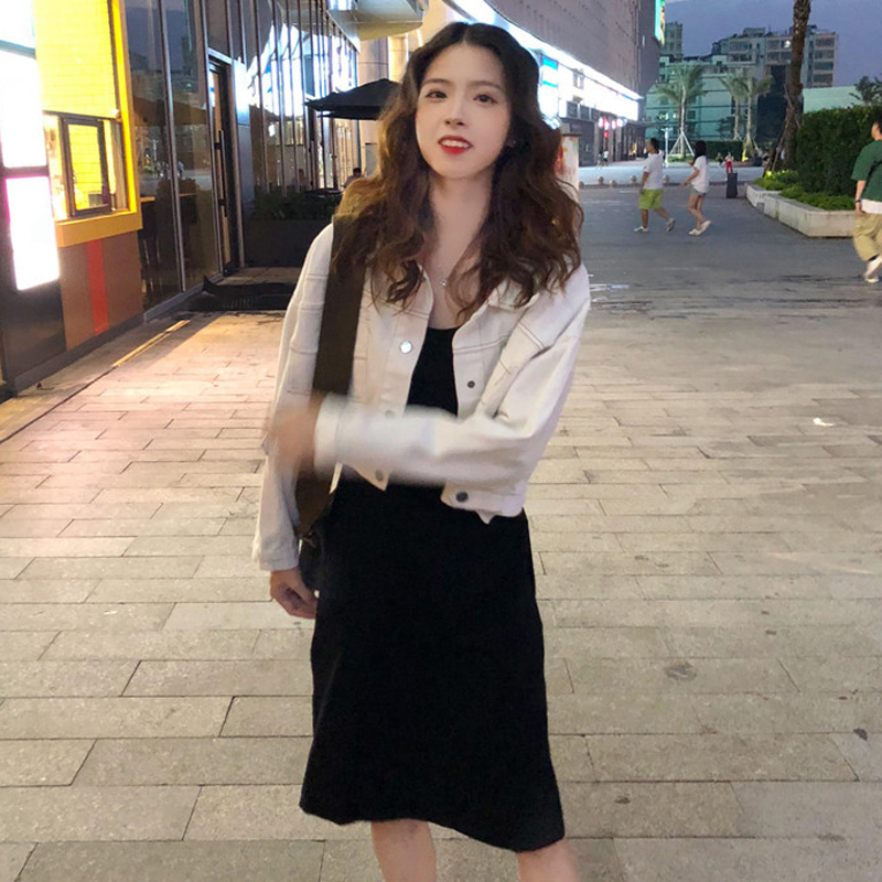 / 韓版時尚休閑套裝秋季女裝短款牛仔外套+中長款吊帶連衣裙兩件套