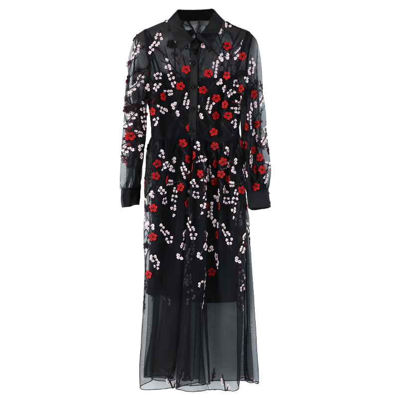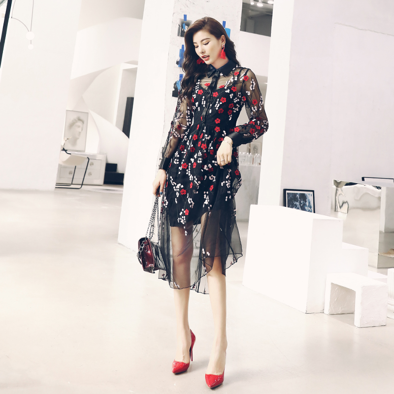 / 長袖連衣裙秋裝女2018新款中長款繡花襯衫長裙子吊帶兩件套裝潮
