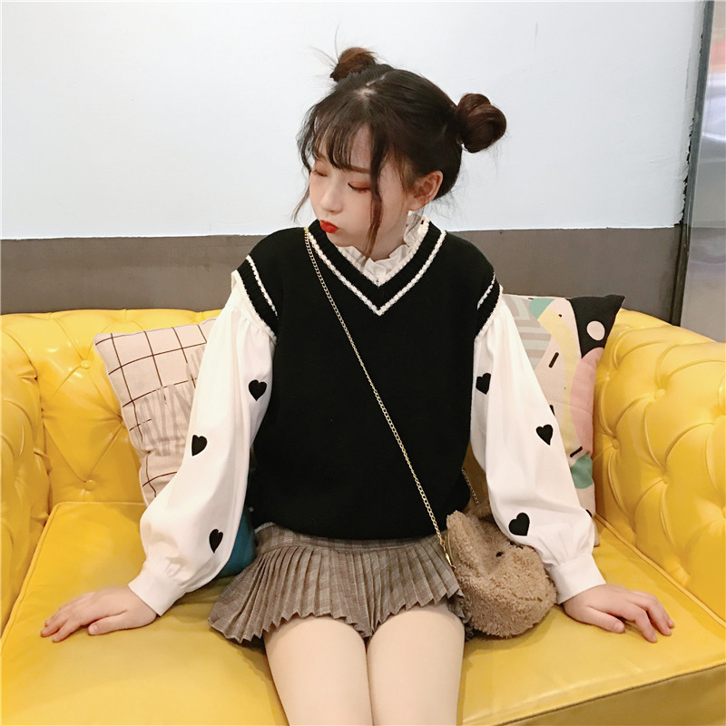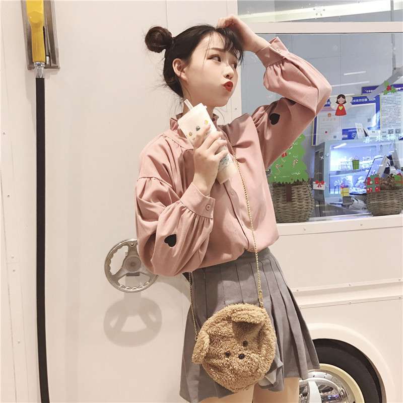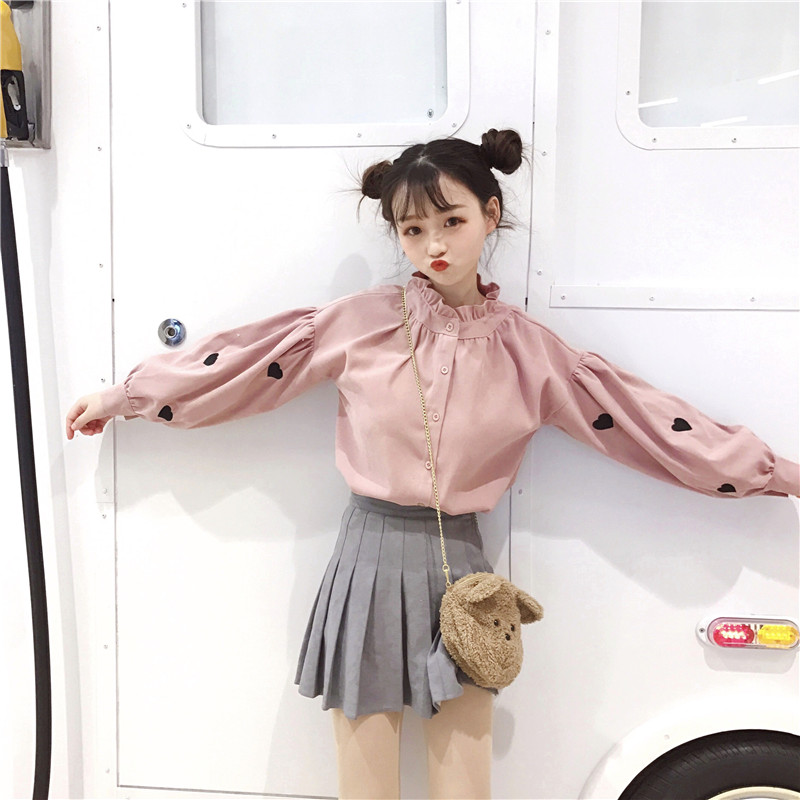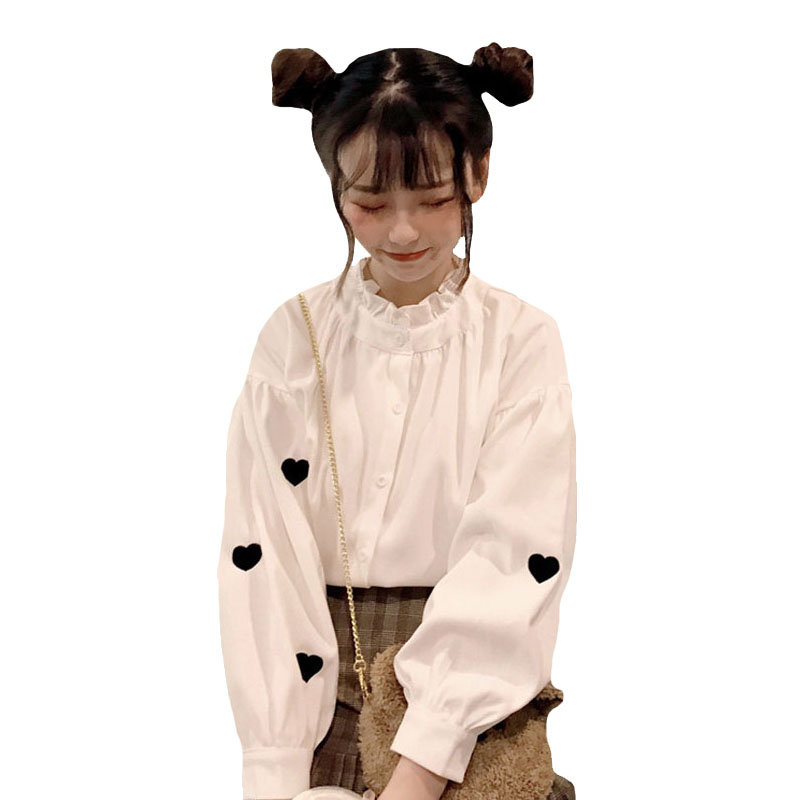 / 秋季女裝韓版寬松小清新心形刺繡木耳邊立領襯衣長袖休閑襯衫上衣