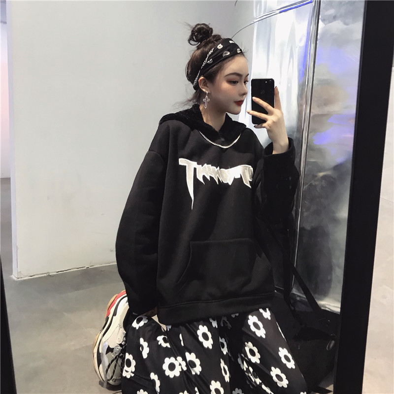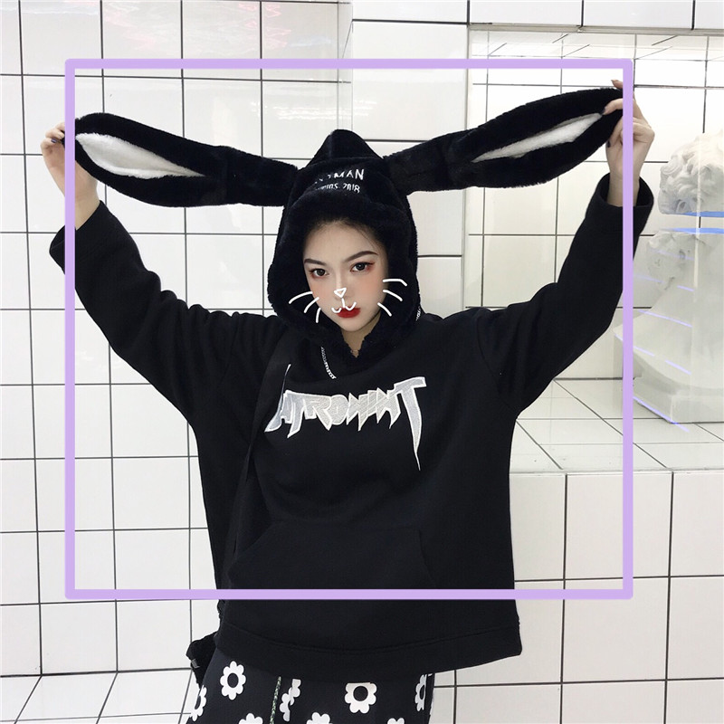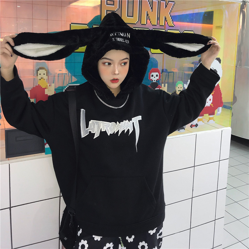 韓版酷酷風個性百搭寬松加厚兔耳朵帽子情侶長袖連帽衛衣外套女潮