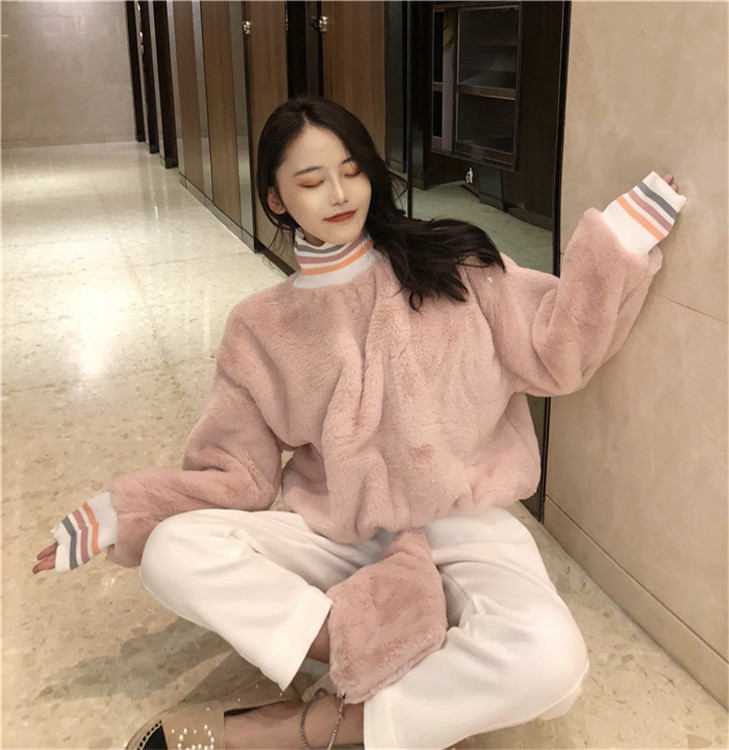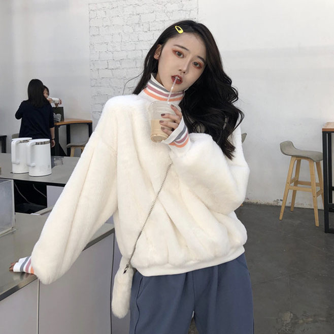 / 韓版慵懶風上衣女寬松百搭高領套頭長袖毛毛衛衣女配送毛毛包包女