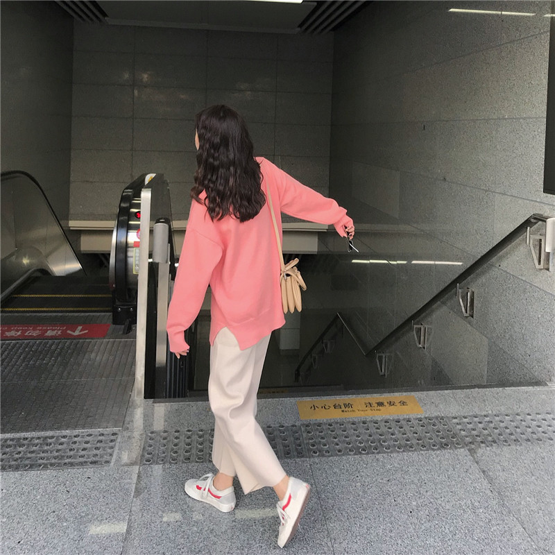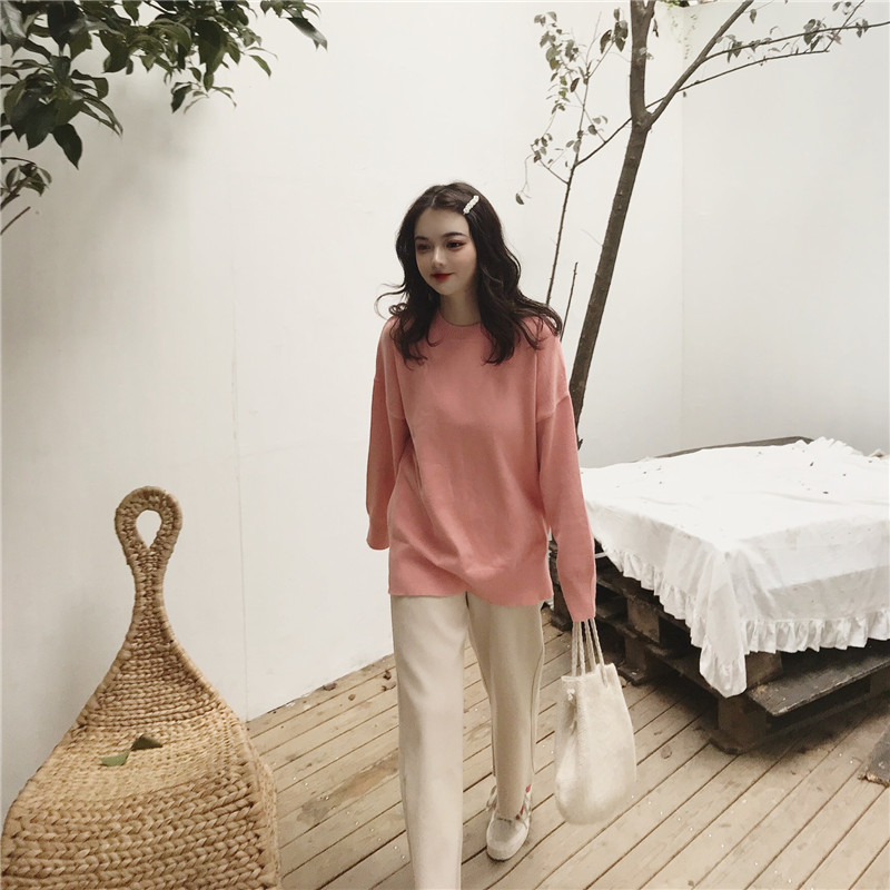/ 韓版chic甜美風粉色寬松圓領毛衣+顯瘦百搭純色毛呢闊腿褲兩件套