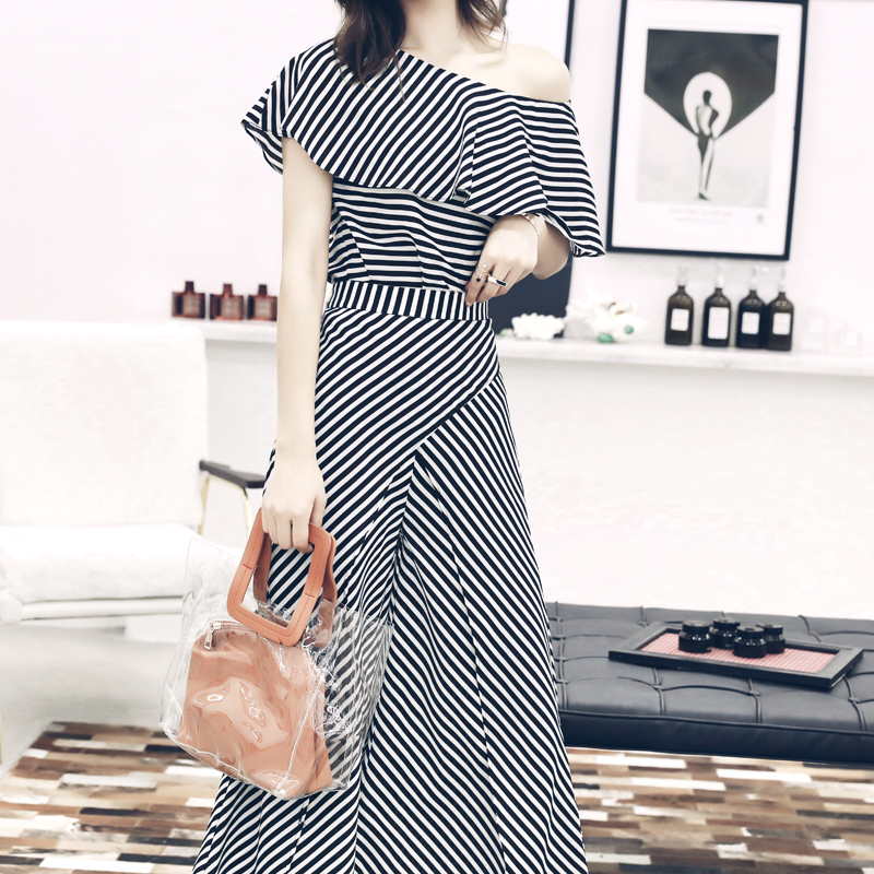 歐洲站2018夏裝新款女裝chic風條紋吊帶性感露肩上衣闊腿褲兩件套