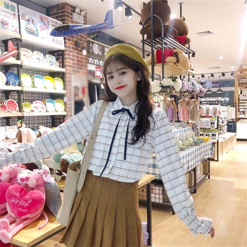 / 秋季女裝2018新款韓版復古港風格子襯衫寬松休閑長袖襯衣上衣學生