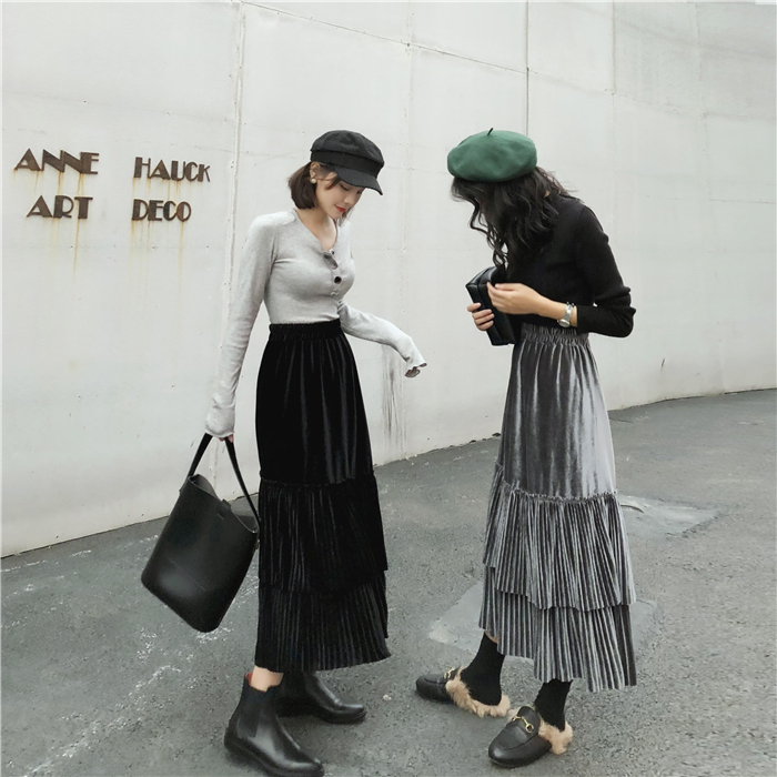 裙子女秋冬新款韓版寬松百搭絲絨百褶裙半身裙高腰A字裙學生長裙