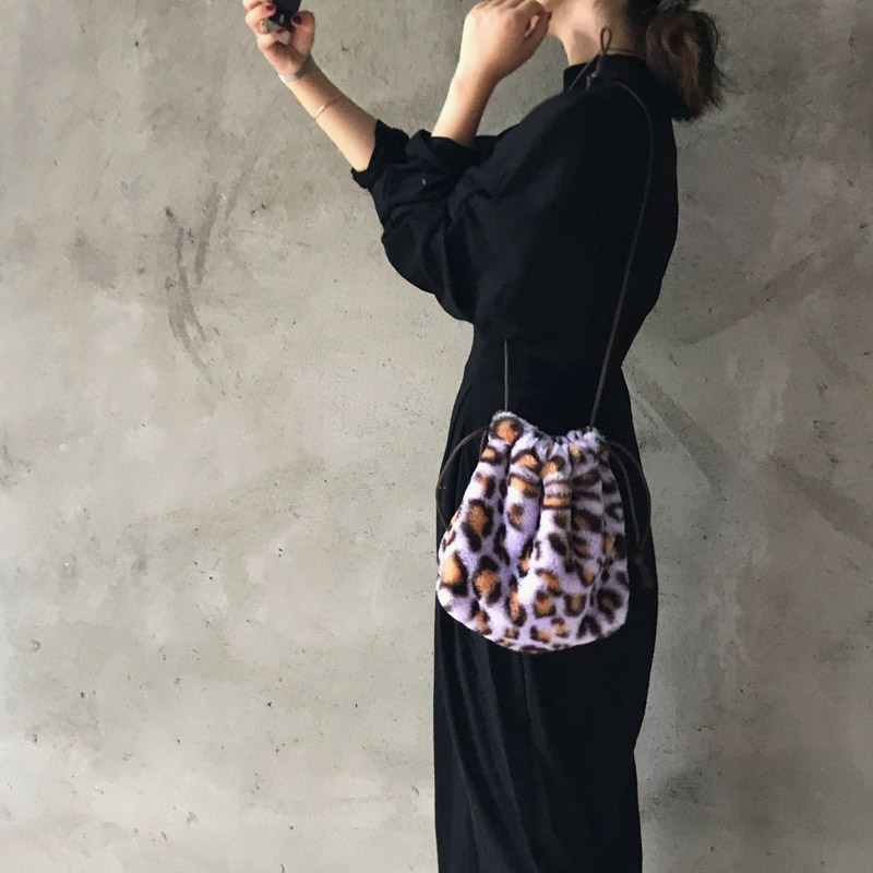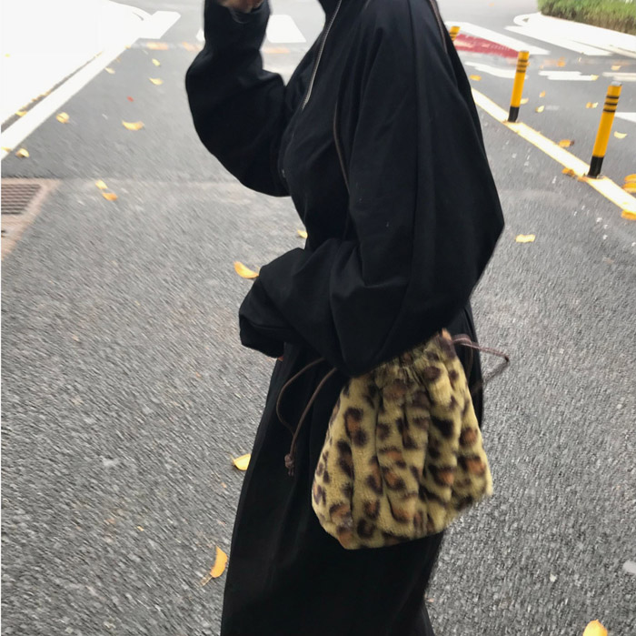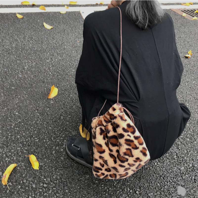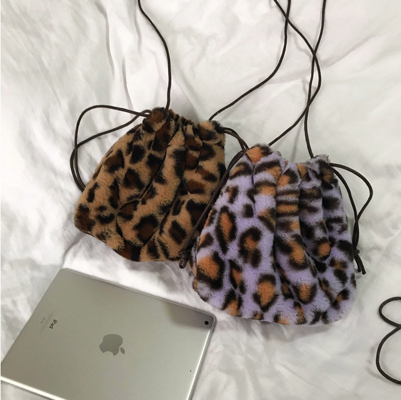 韓系時尚chic風秋季新品氣質彩色豹紋百搭抽繩毛絨包斜跨單肩包女