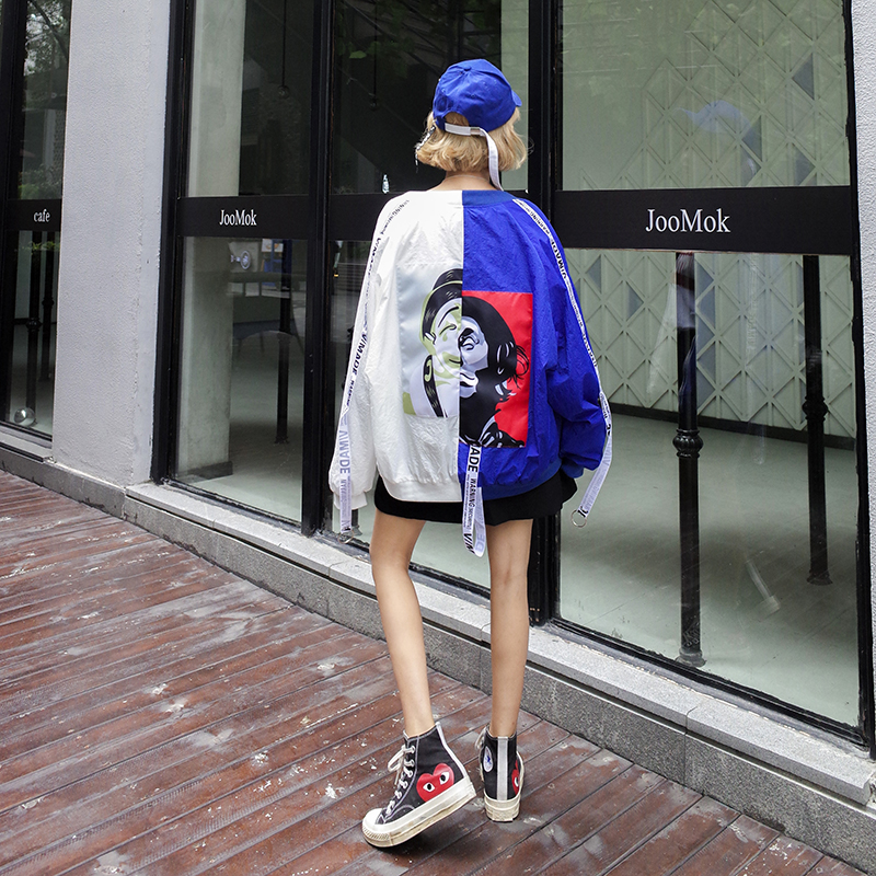 2017秋新款bf原宿學院風貼布拼色織帶棒球服男女情侶裝百搭外套潮