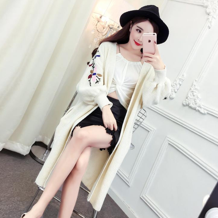 / 秋裝新款2017韓版氣質寬松長袖針織開衫開叉刺繡中長款毛衣外套女