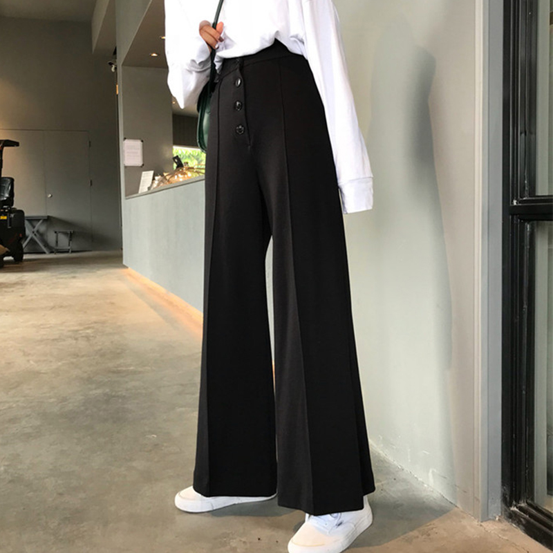 / 褲子女秋季2018新款寬松高腰墜感闊腿褲學生排扣黑色休閑長褲女裝