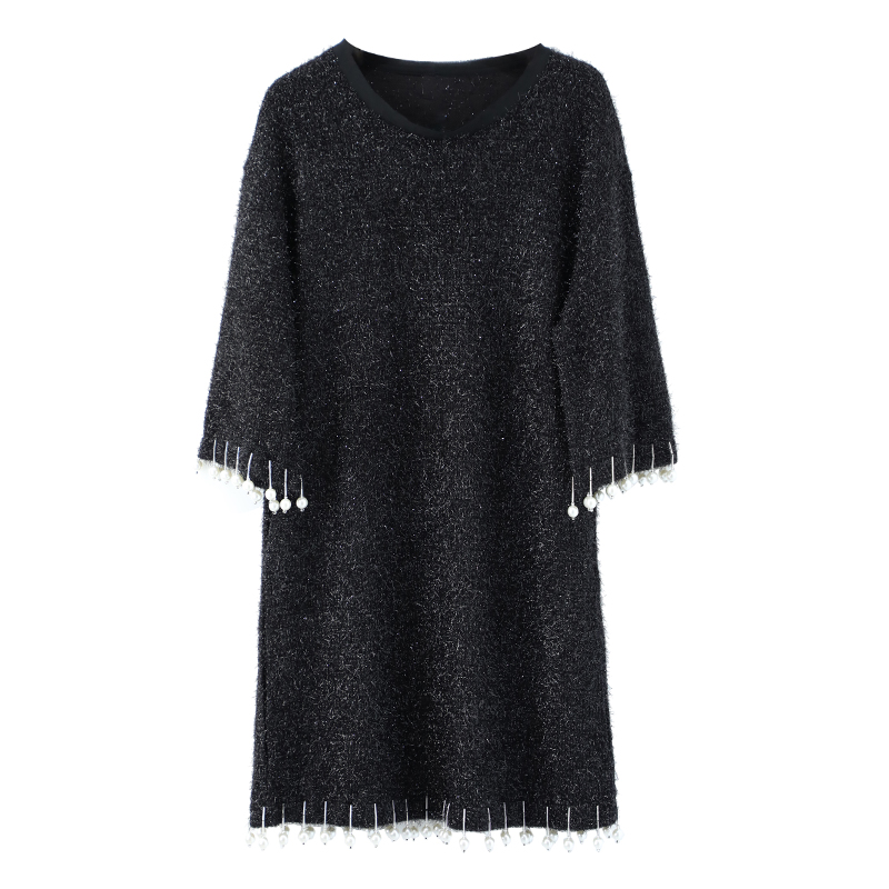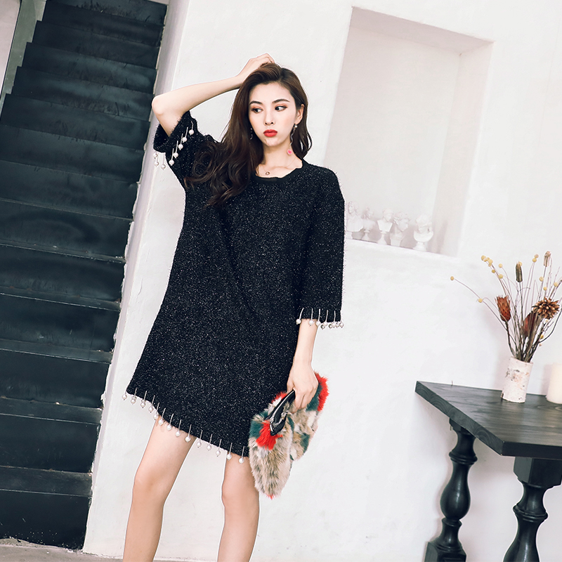 / 名媛氣質2018新款女秋裝寬松減齡藏肉釘珠連衣裙五分袖中長裙子潮