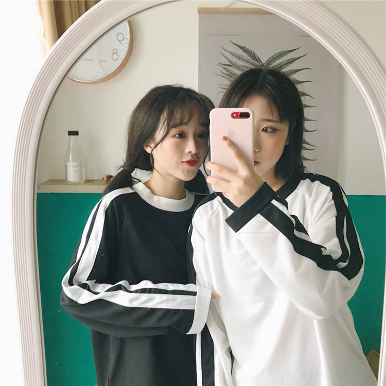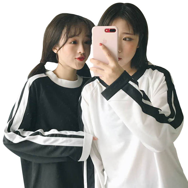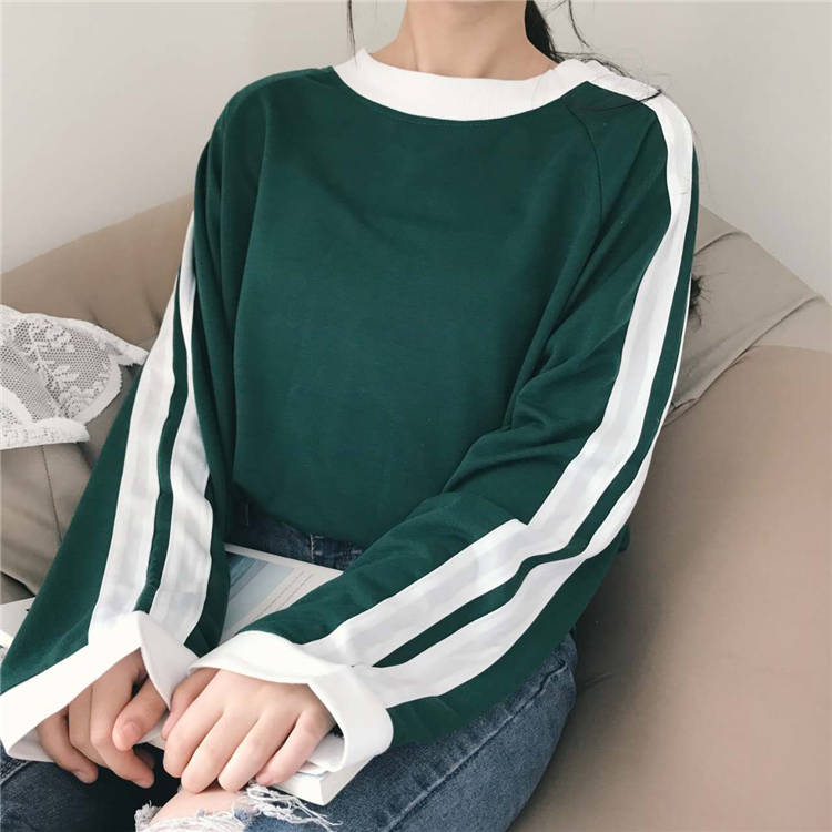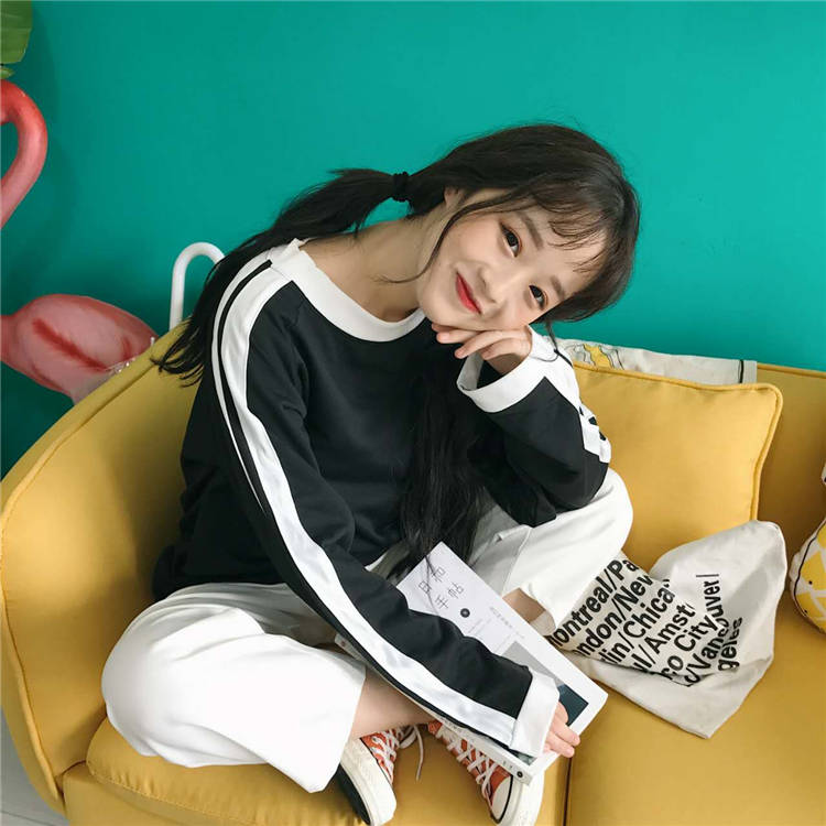 / 秋裝女裝韓版百搭休閑運動t恤寬松撞色長袖圓領套頭衛衣上衣外套