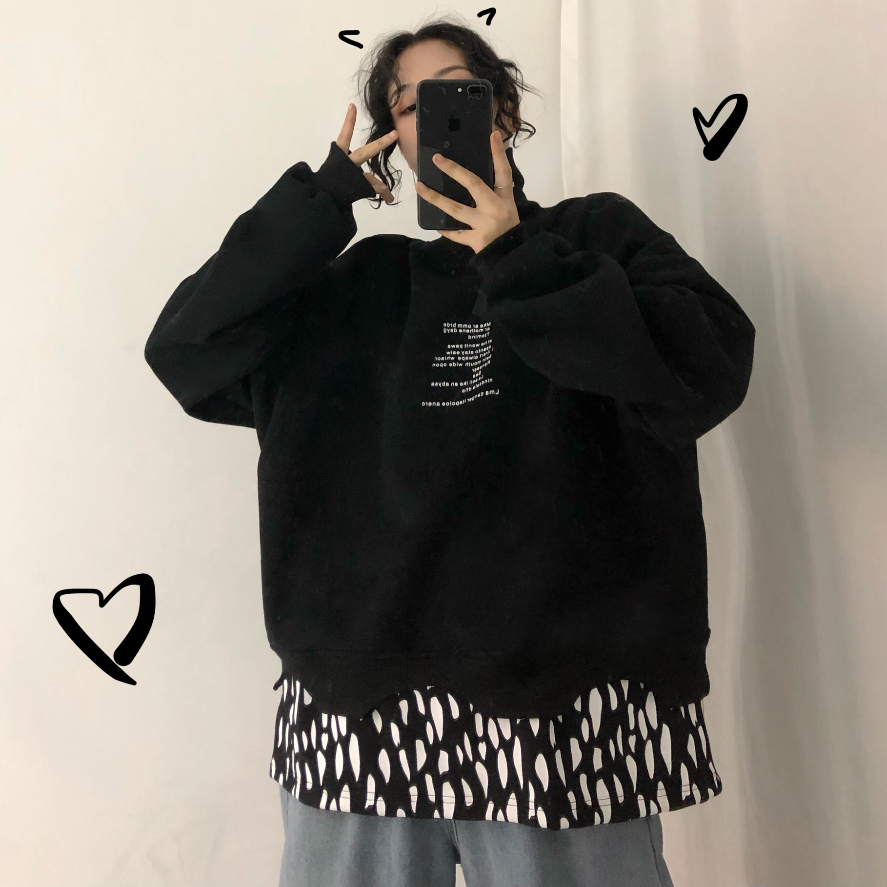/ 韓版小高領拼接豹紋加絨寬松衛衣女秋冬2018新款個性長袖加厚上衣