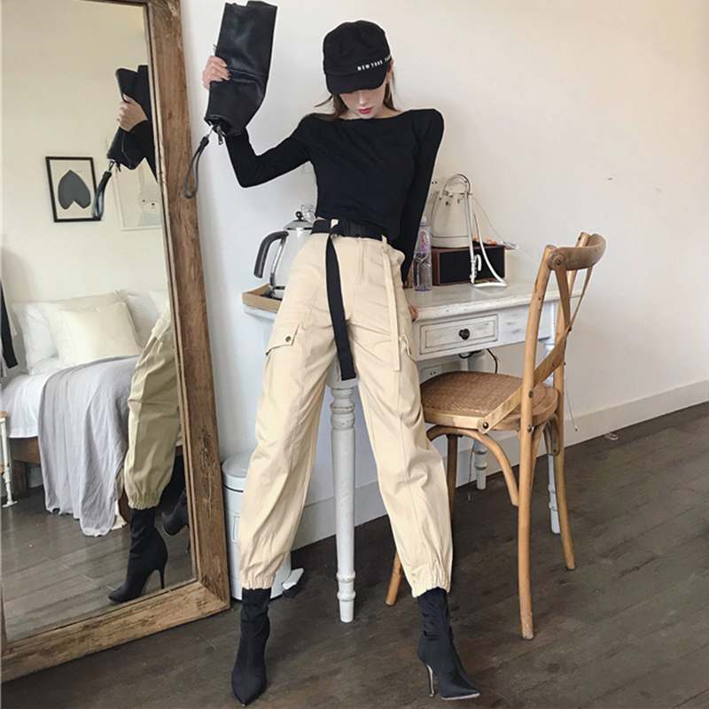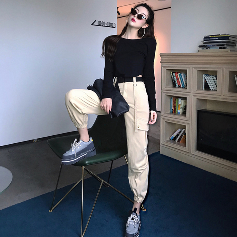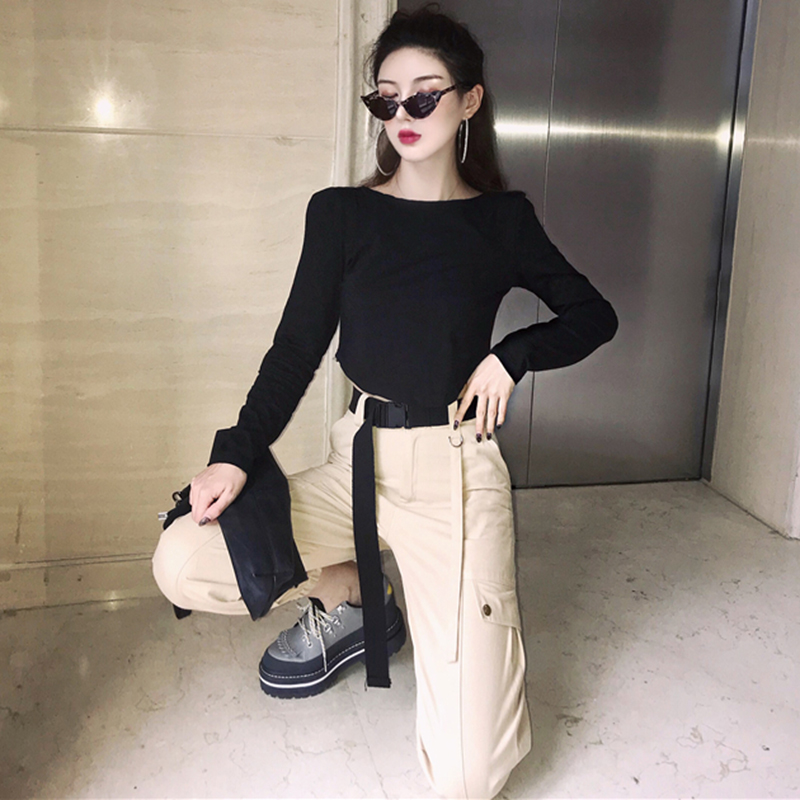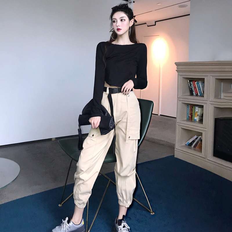 / 時尚套裝女秋新款修身長袖打底T恤黑色短上衣高腰工裝哈倫長褲子