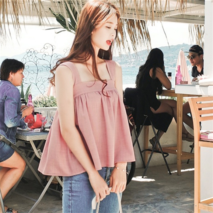 2017泰國度假旅游波西米亞小清新甜美純色短款娃娃衫一字領小吊帶