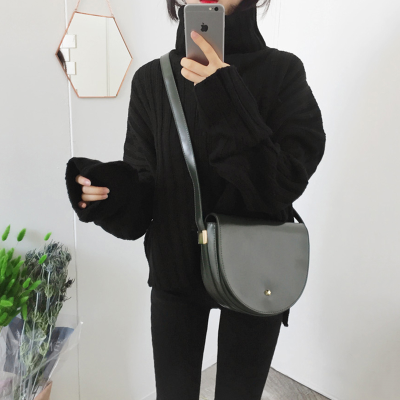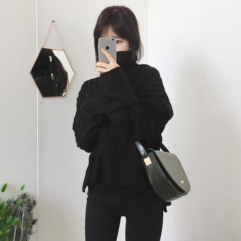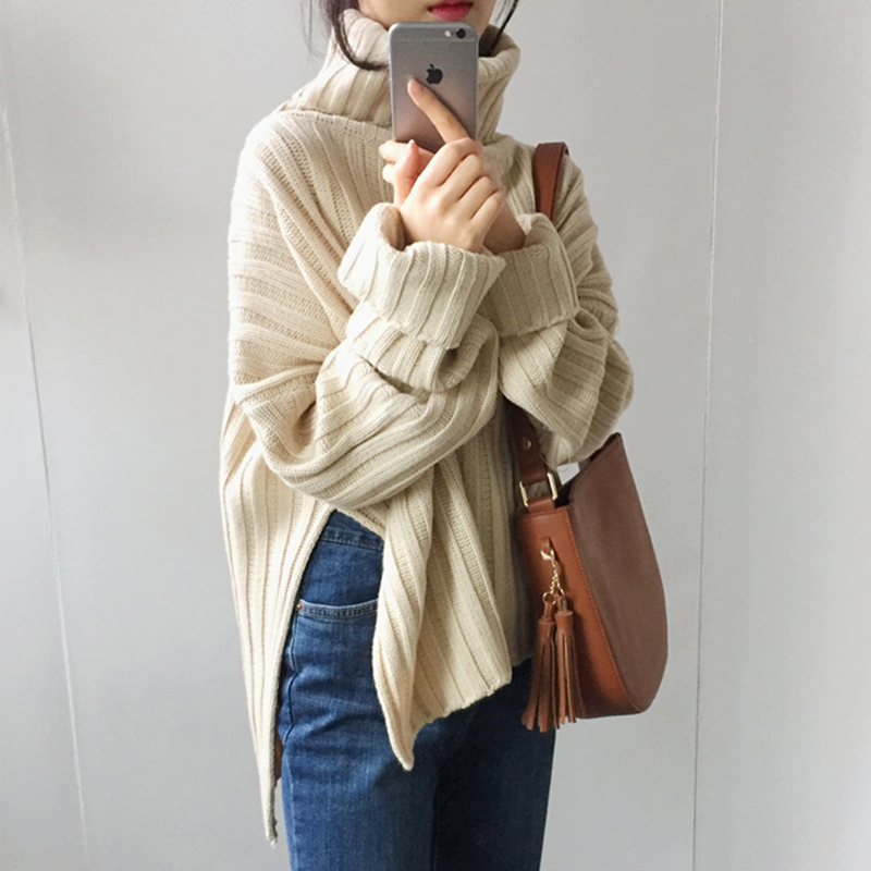/ 秋冬女裝新款寬松坑條純色套頭毛衣女學生開叉高領長袖針織衫上衣