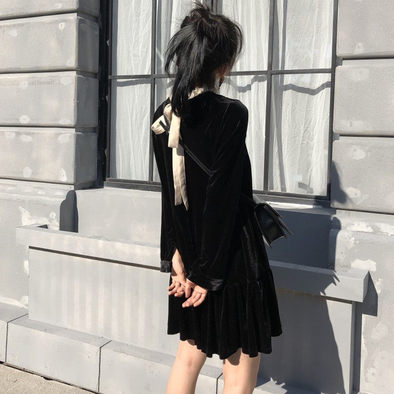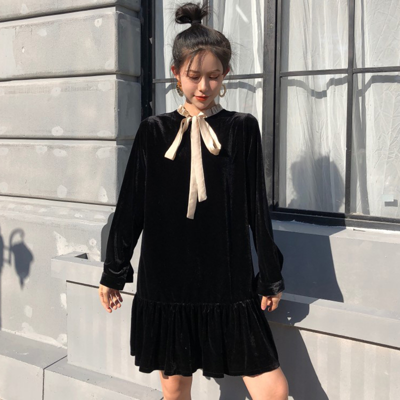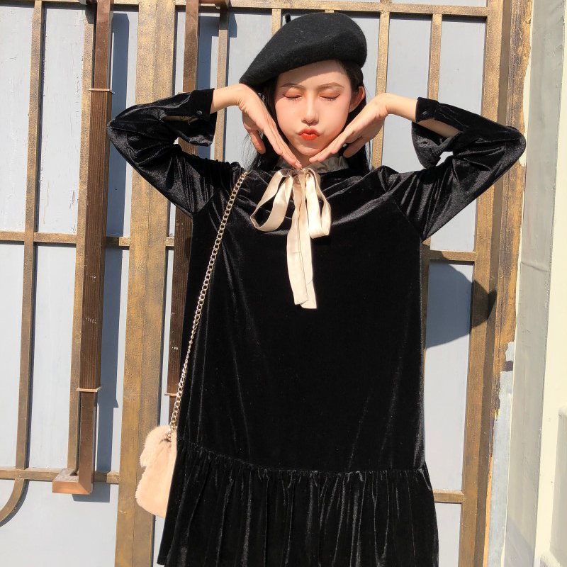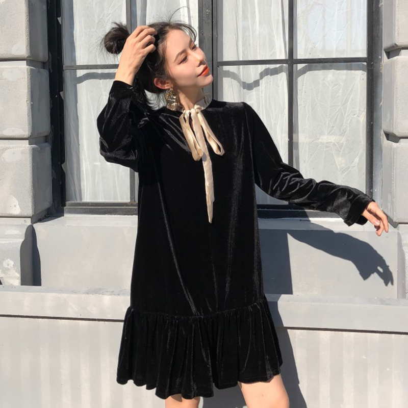 法式絲絨egg連衣裙女秋冬裝2018新款韓版前后兩穿荷葉邊中長裙子