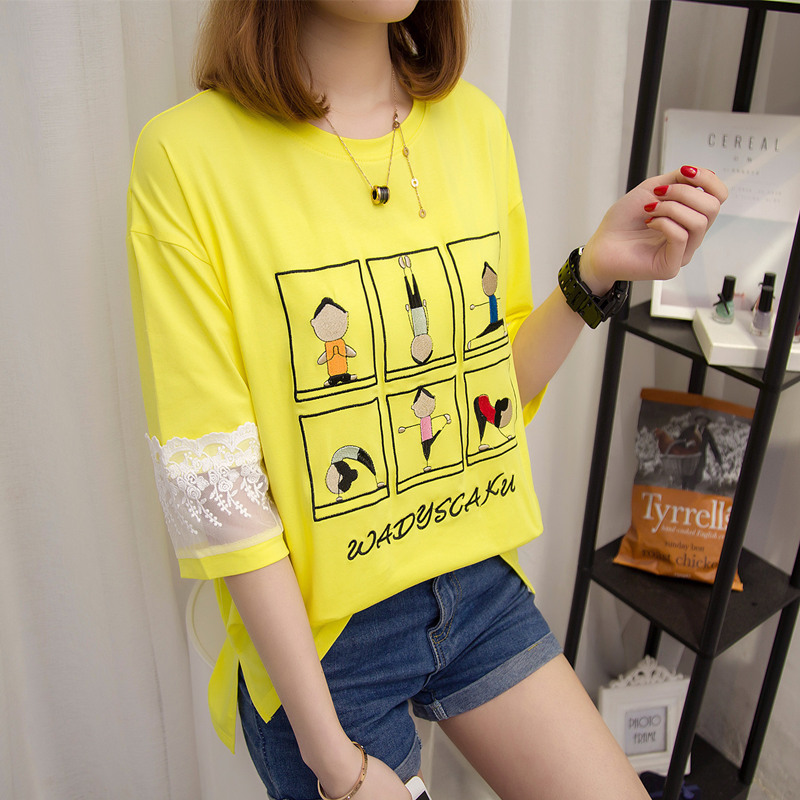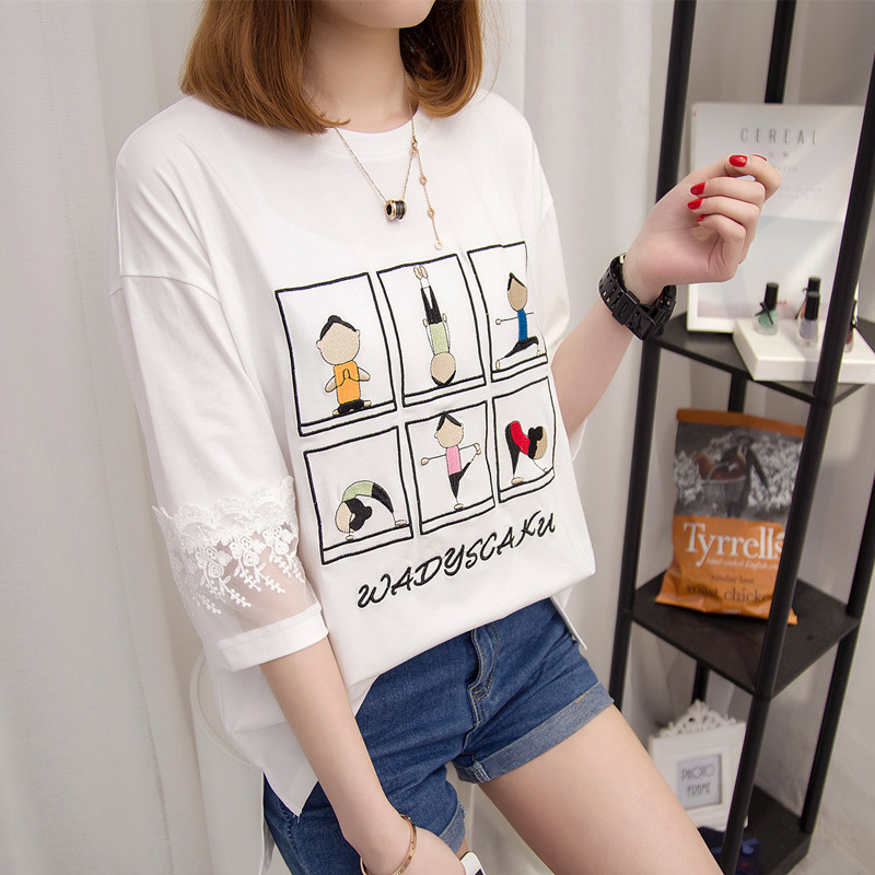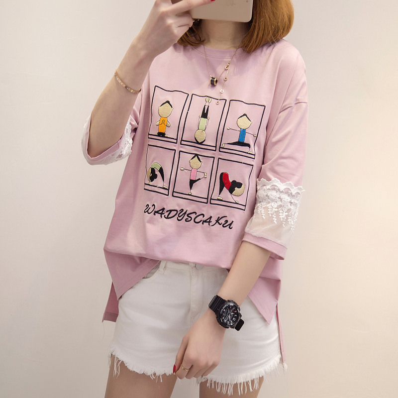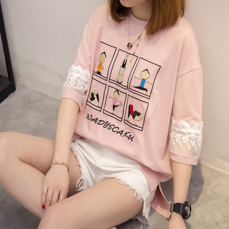 短袖上衣女夏新款蕾絲t恤女中長袖韓版寬松打底體恤衫百搭潮