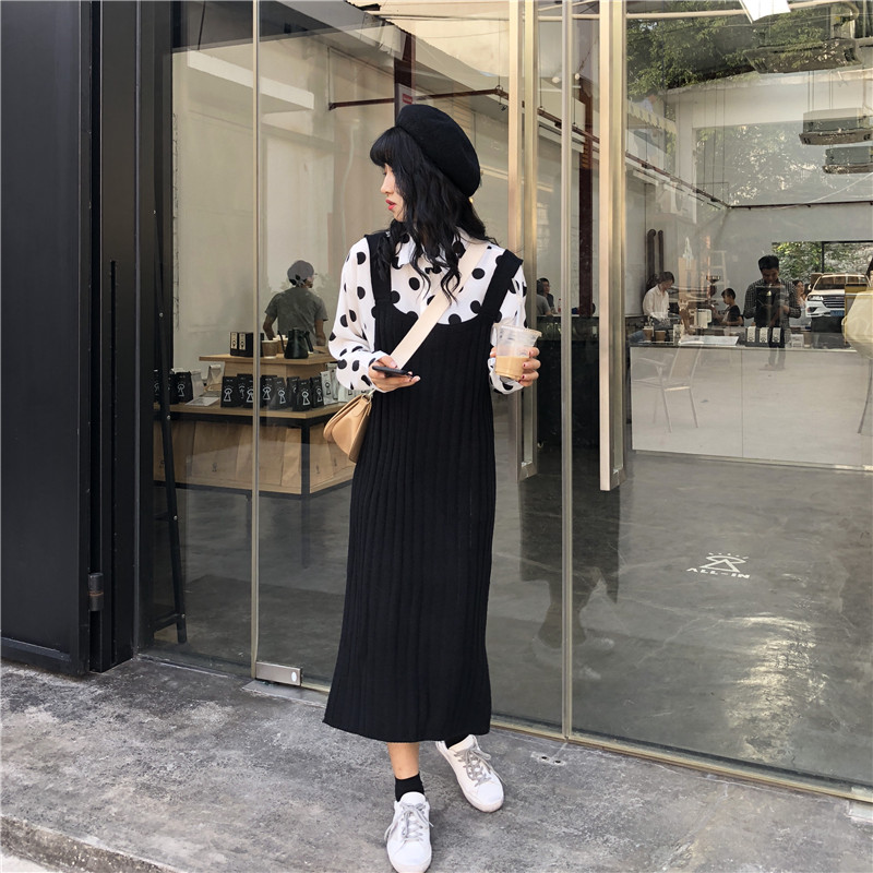 / 韓版時尚休閑套裝秋季女裝chic波點襯衣+針織背帶裙連衣裙兩件套