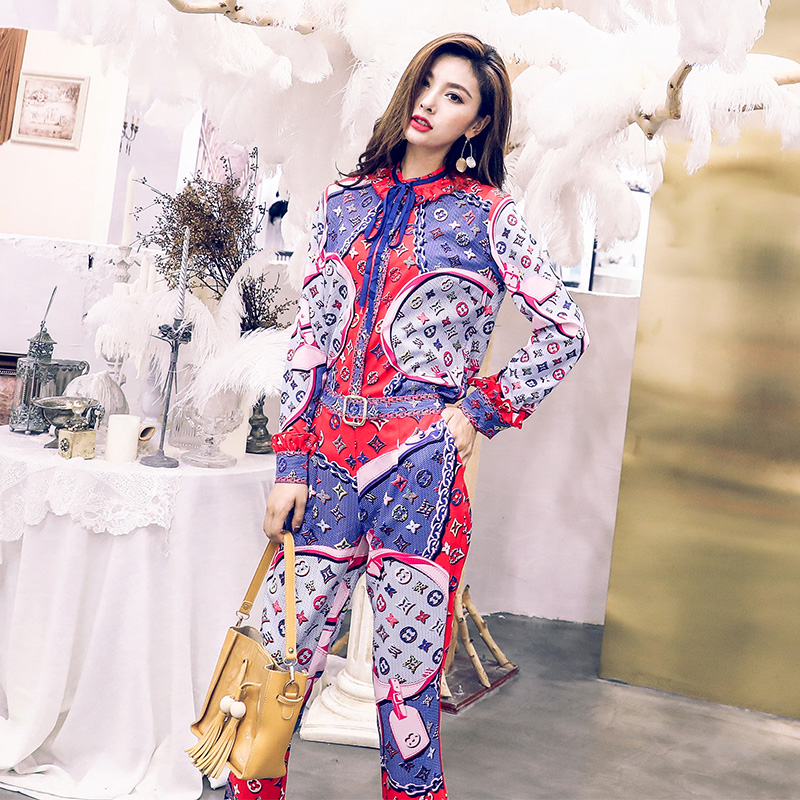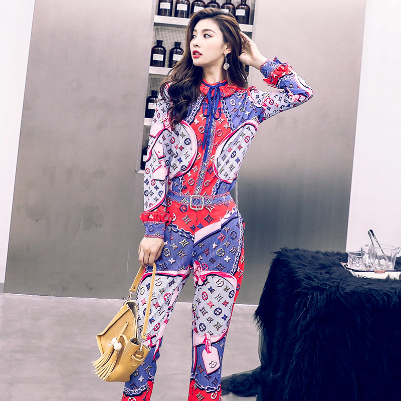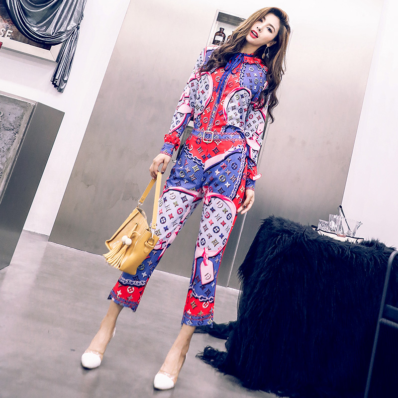 / 網紅2018秋季新款女長袖chic印花襯衫上衣小腳褲七分褲兩件套裝潮