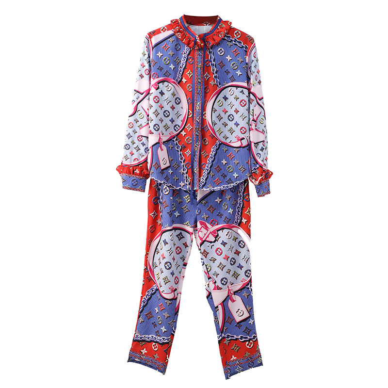 網紅2018秋季新款女長袖chic印花襯衫上衣小腳褲七分褲兩件套裝潮
