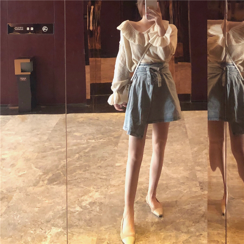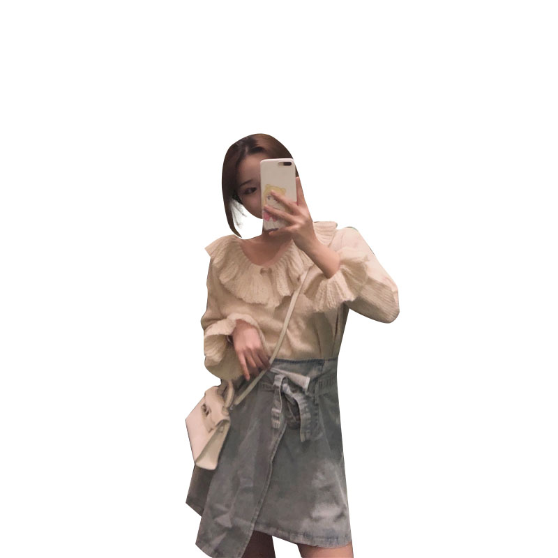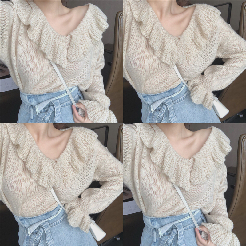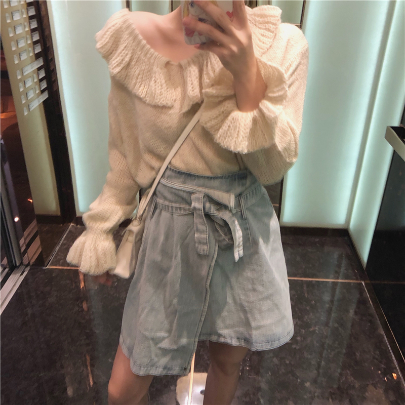/ 早秋女裝新款韓國chic風減齡荷葉邊純色寬松百搭喇叭袖毛衣上衣潮