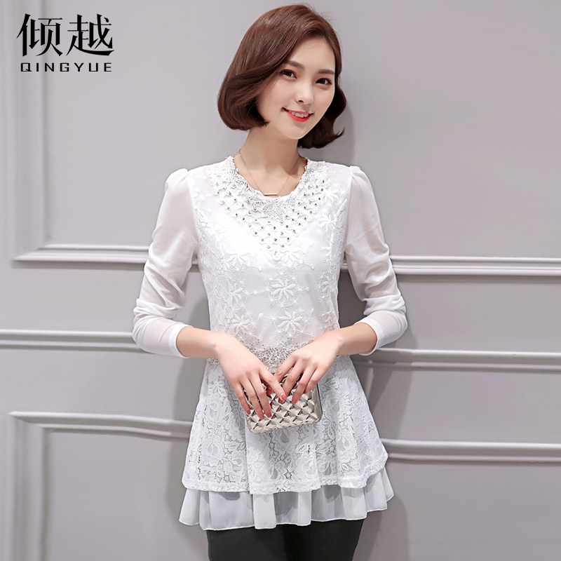 / 傾越2017春款女裝中長款蕾絲衫鑲鉆鏤空打底衫修身顯瘦雪紡上衣潮