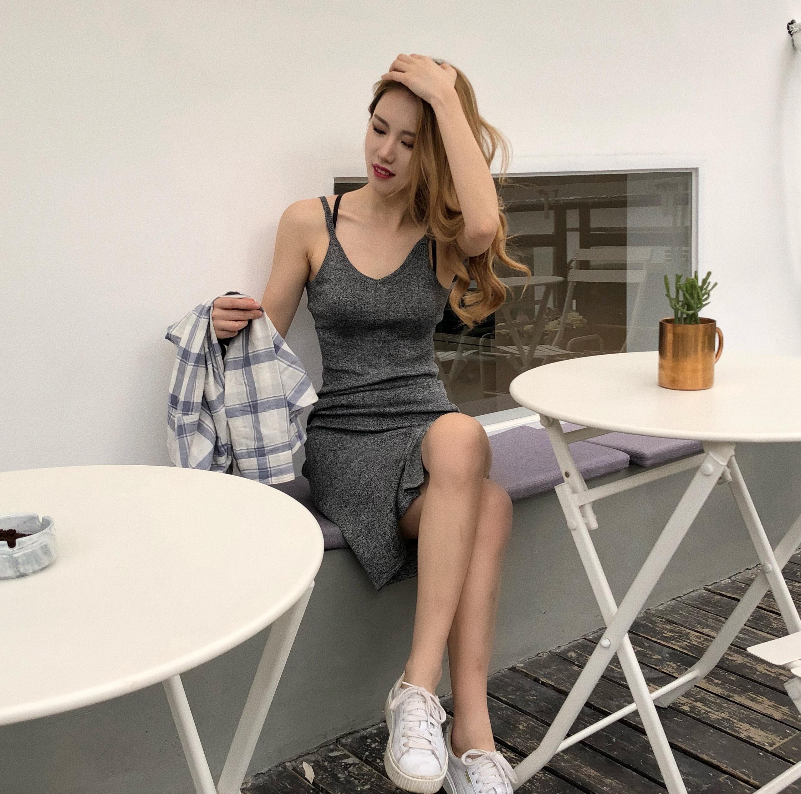 / 連衣裙新款2018港味百搭性感V領包臀緊身修身顯瘦針織吊帶開叉裙