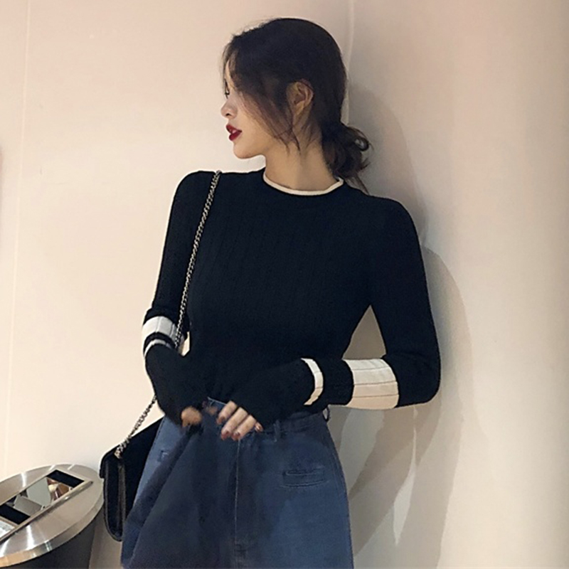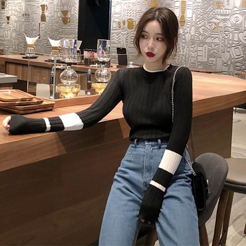 圓領外穿套頭毛衣女秋冬裝2018新款拼色上衣修身顯瘦打底針織衫潮