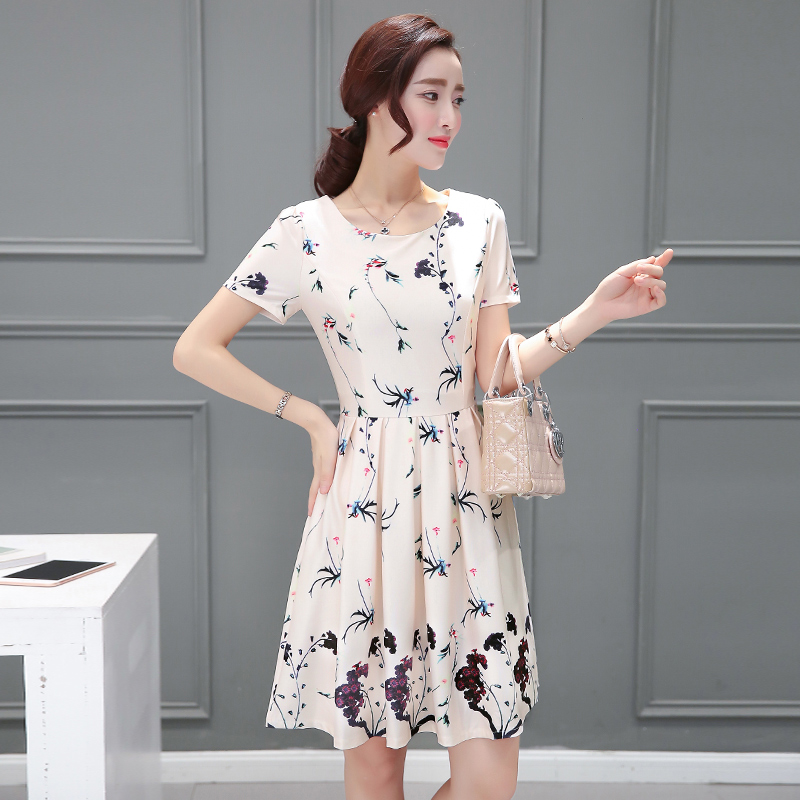 / 新款夏裝印花雪紡中長款圓領連衣裙女裝修身韓版A字裙蓬蓬裙