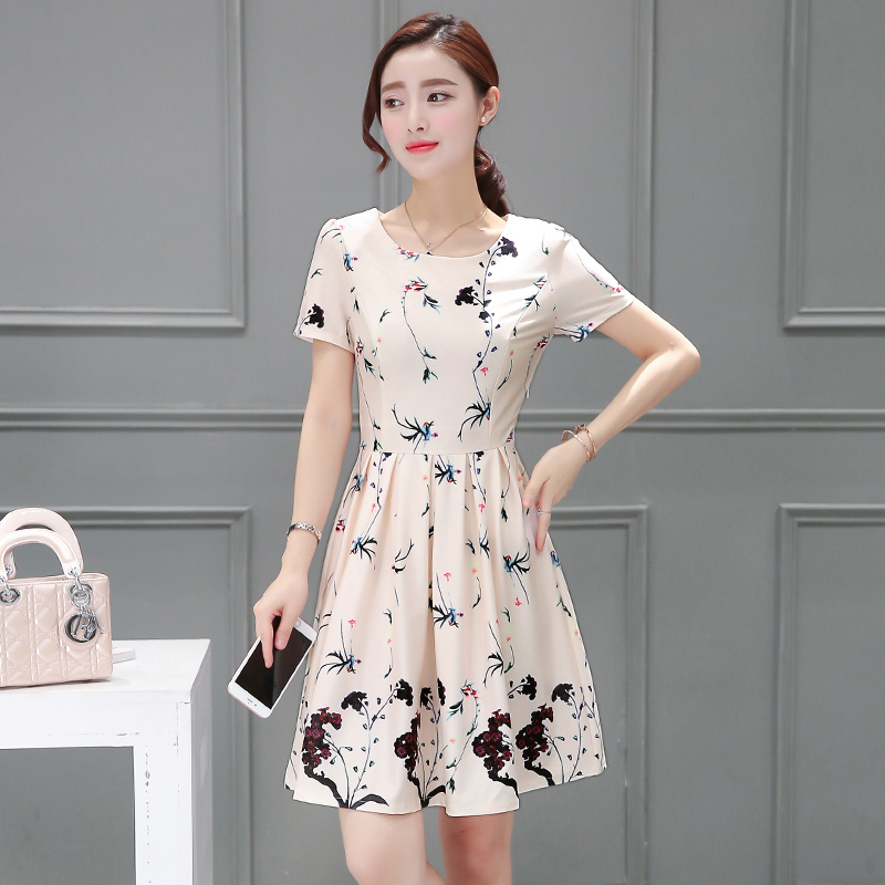 新款夏裝印花雪紡中長款圓領連衣裙女裝修身韓版A字裙蓬蓬裙