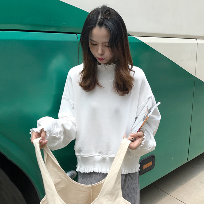 / 慵懶毛衣秋裝女2018新款長袖寬松加絨衛衣學生木耳邊高領黑色外套