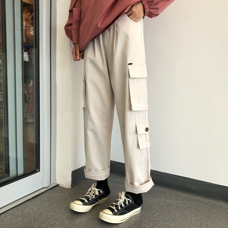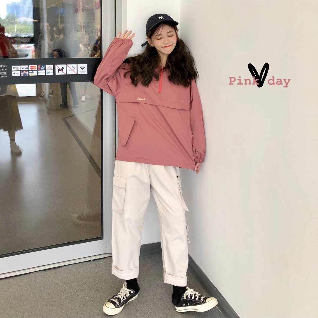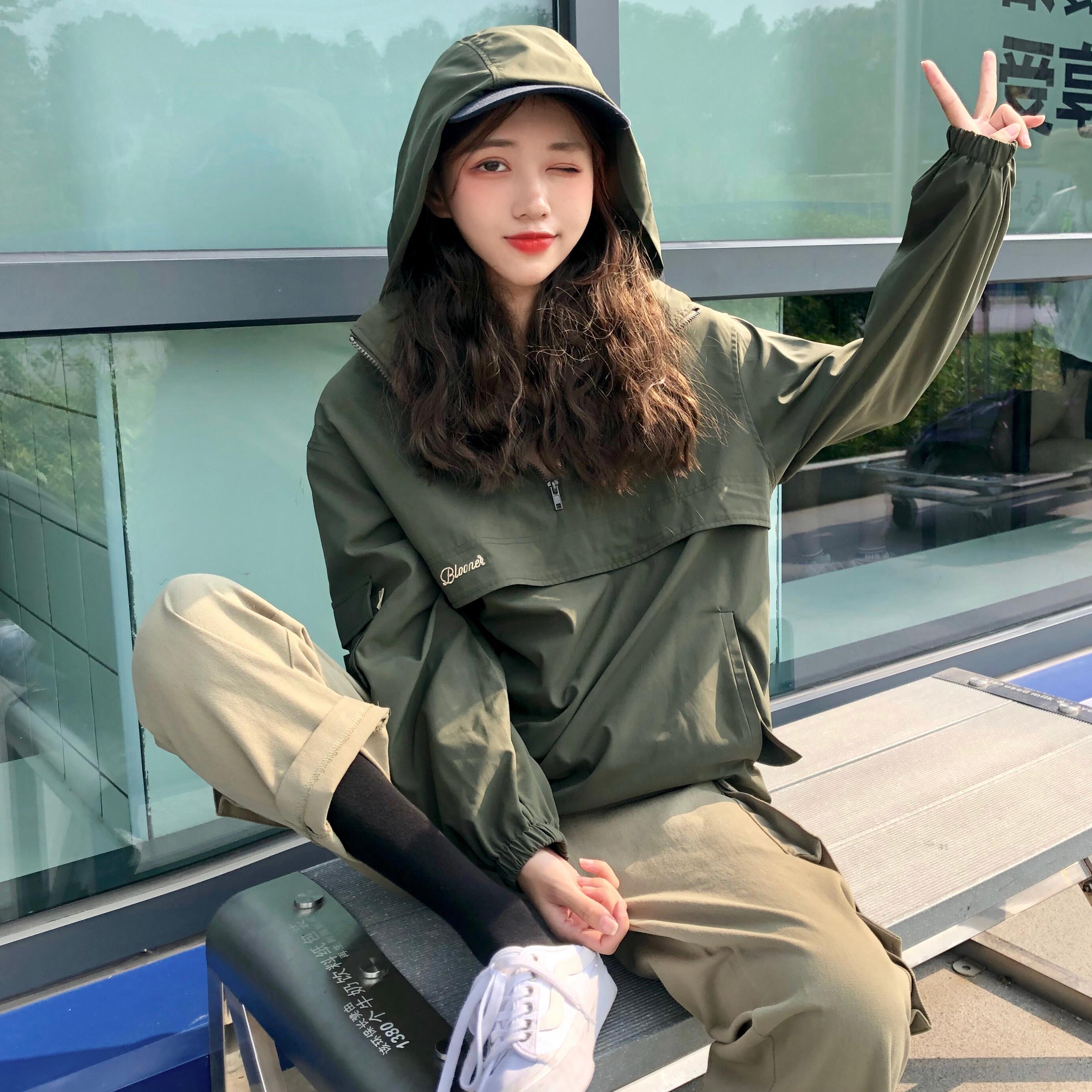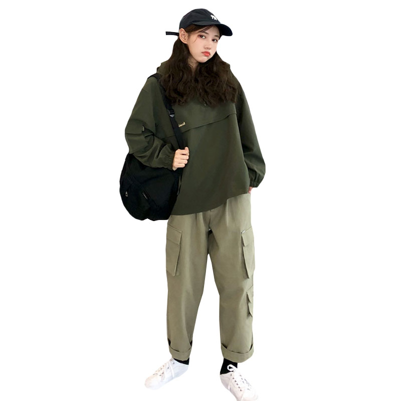 秋季韓版原宿風寬松連帽復古港風工裝上衣外套+直筒休閑褲長褲女