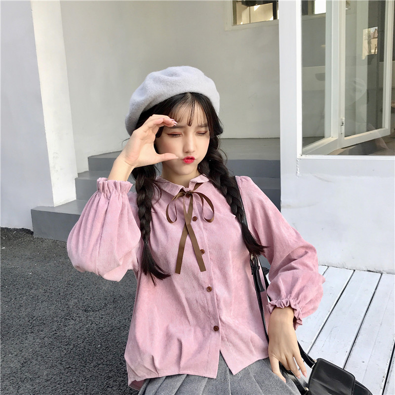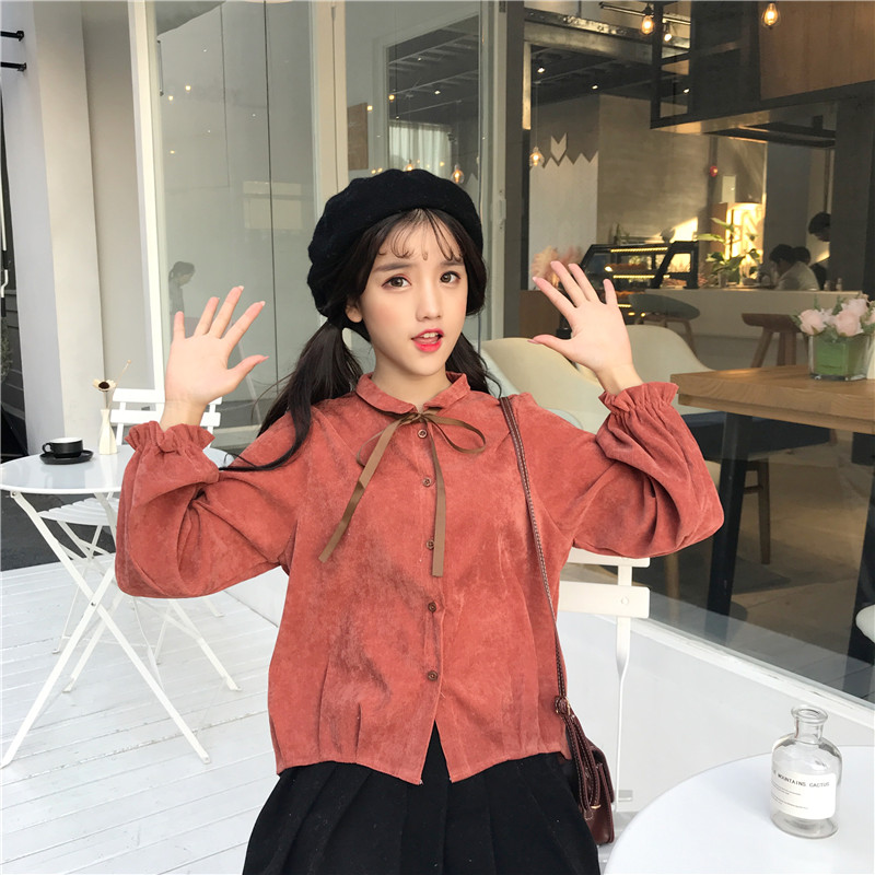 / 秋裝女裝韓版小清新燈芯絨蝴蝶結系帶長袖襯衫上衣學生打底衫襯衣