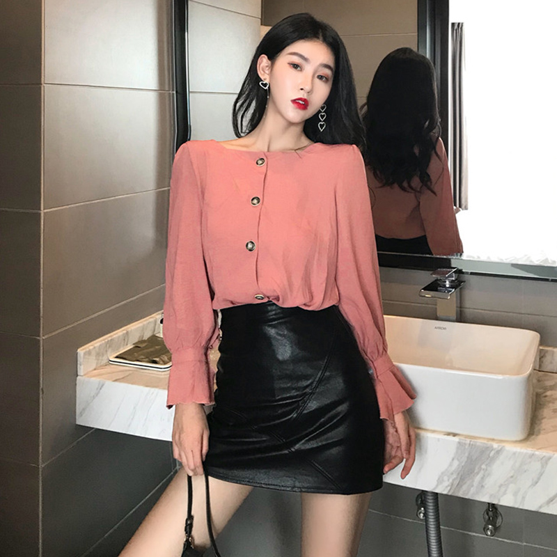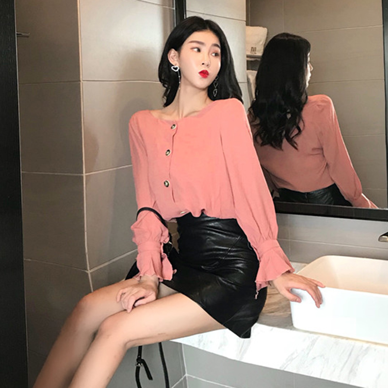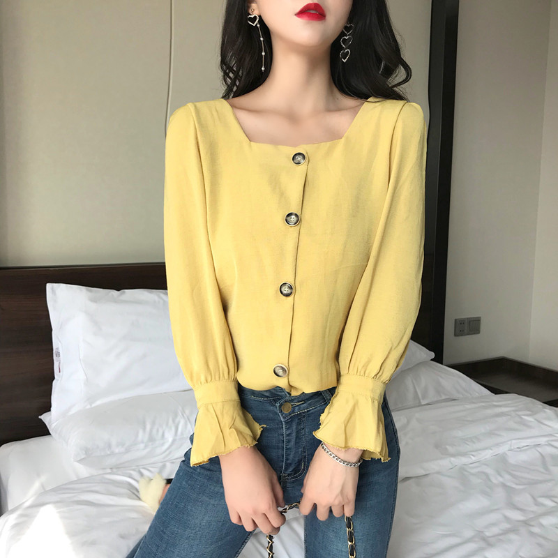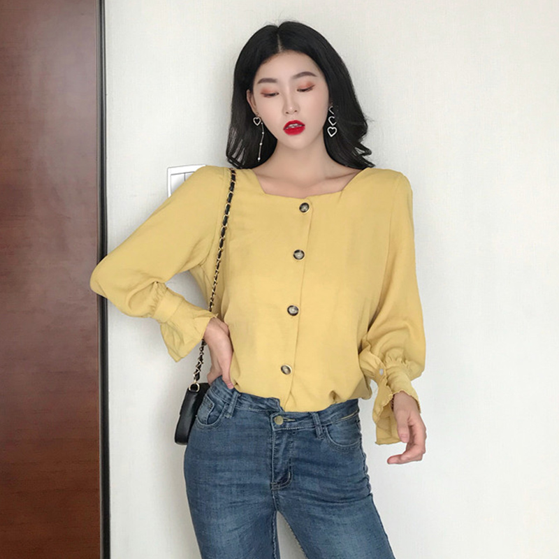 氣質漏鎖骨單排扣白襯衫女秋裝2018新款復古顯瘦方領荷葉長袖上衣